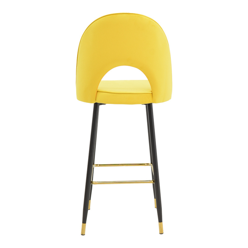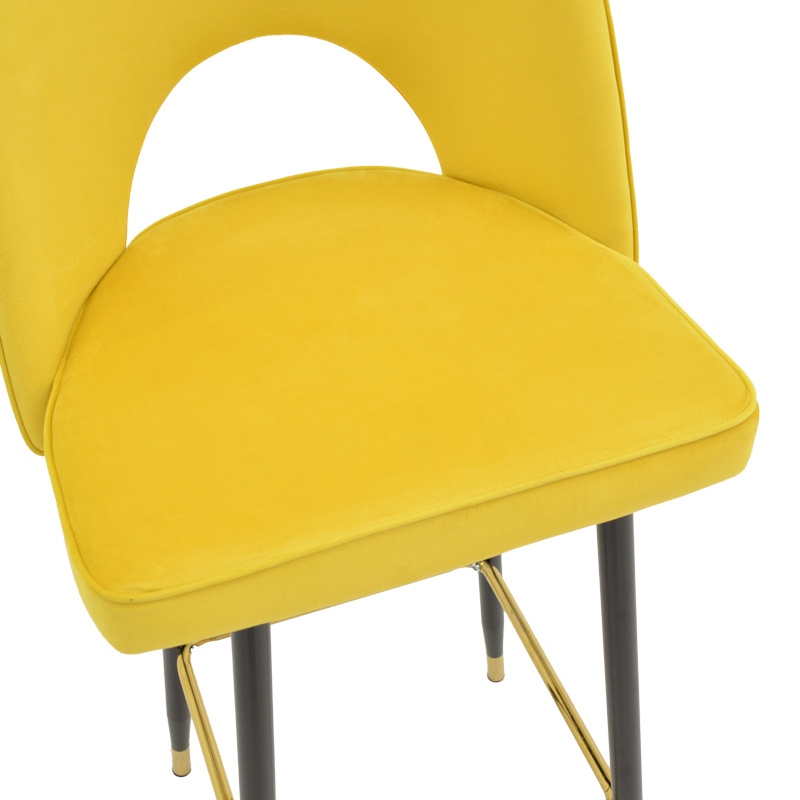 Този елегантен бар стол съчетава модерен дизайн с функционалност, идеален за всяко съвременно пространство. Изработен с внимание към детайла, столът предлага комфорт и стил. Седалката и облегалката са облечени в мек текстил, който придава усещане за лукс и уют. Яркият жълт цвят на тапицерията добавя свежест и енергия, правейки го акцент във всяка стая.