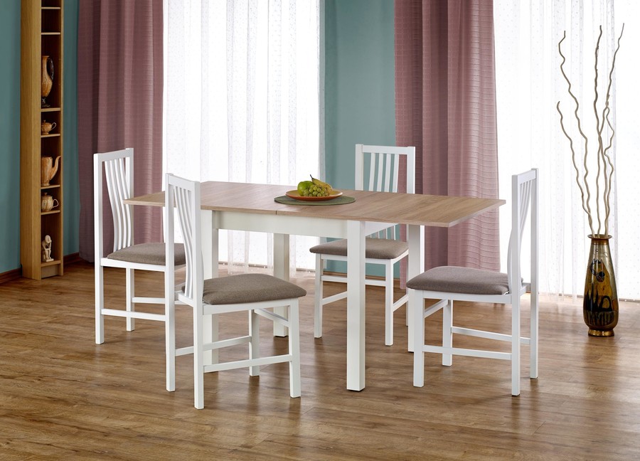 Трапезна маса – Таблицата с сгъване се предлага в четири цвята: гайка, дъб, дъб на Сонома и елша. Всеки от тях ще се хареса на всички хора, които ценят класическите и стилни решения, пълни с елегантност и безвременна класика. Това е парче мебели не само много красиво, но и практично. Поради факта, че е разбит, той може да работи както по време на ежедневната закуска, така и по време на големи срещи със семейството или приятелите.