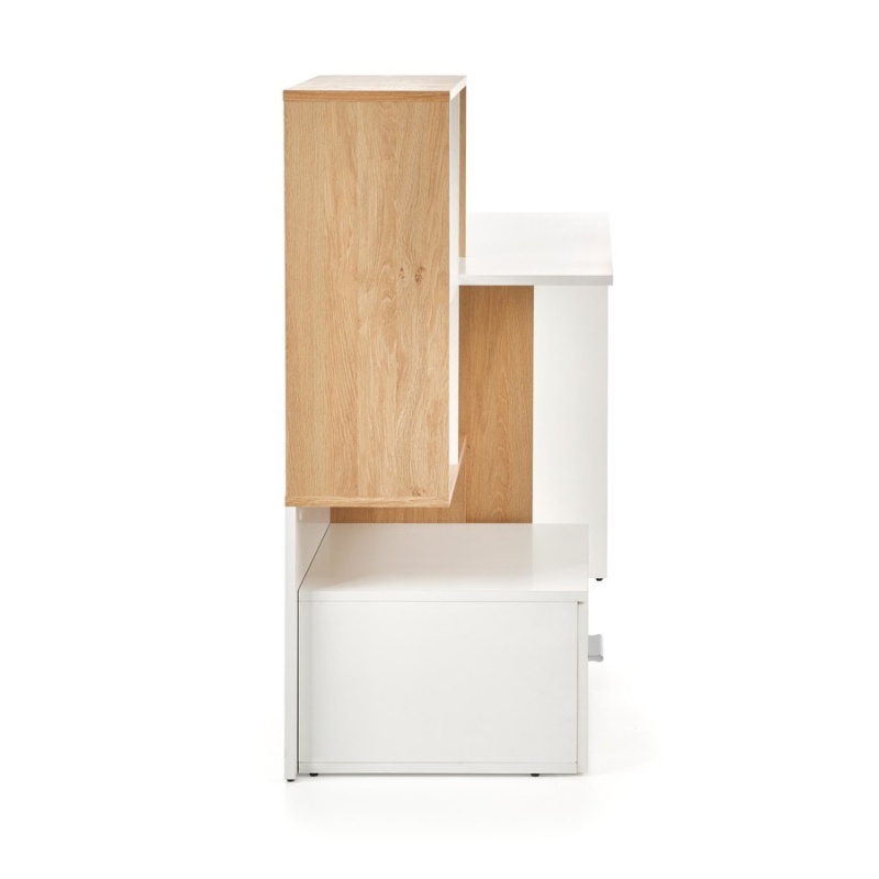 Бюро – е модерно бюро с шкаф за книги, който ще намери много приложения. Строителството ще се хареса на тези, които ценят добрата организация на работното място. Бюрото има топ, чиято използваема повърхност ще позволи удобна работа или учене. Чекмеджето ще помогнат за съхраняването на офис материали. Бюрото може да се използва в домашен офис или да се постави в младежкия зала. Въпреки възможностите си, мебелите се характеризират със сравнително малки размери, така че няма да отнеме голям размер в стаята. Бюрото е направено изцяло от ламинирана дъска за мебели. Бюрото и чекмеджето имат бял цвят, докато багажникът е завършен в нюанс на златен дъб. Такива цветове ще ви позволят да съответствате на бюрото с почти всеки интериор.