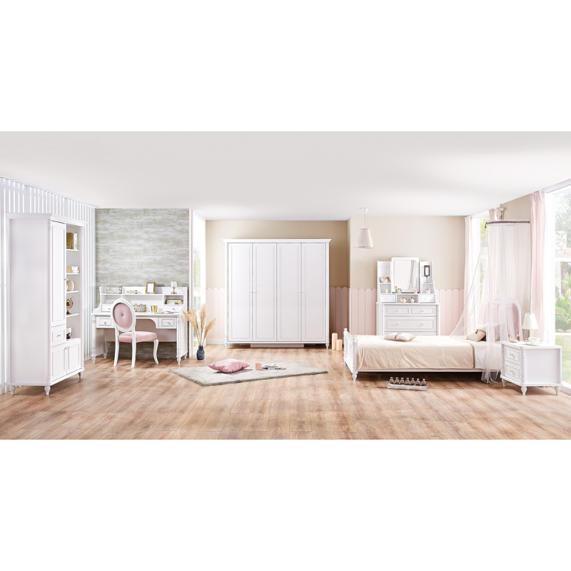 Бялото покритие допринася за чист и свеж вид, който лесно се комбинира с различни цветови палитри в детската стая. Това придава на пространството усещане за простор и светлина, създаващо уютна обстановка за игра, учене и почивка.