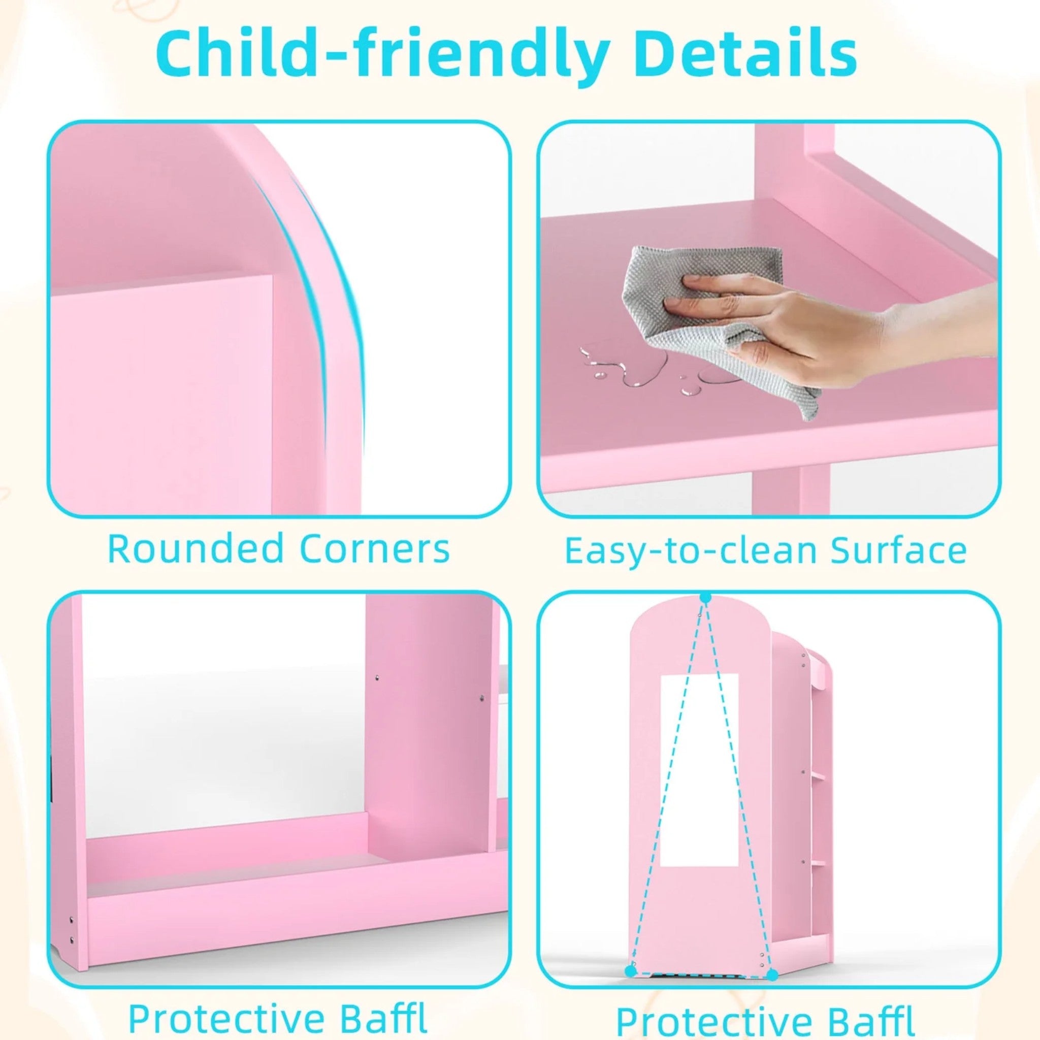 Детска Стойка за Дрехи с Огледало - Отворен Детски Гардероб с Рафтове и Закачалки, Розов, 94x38x100 см