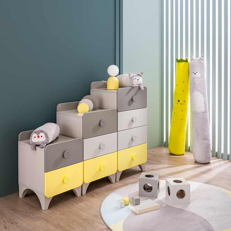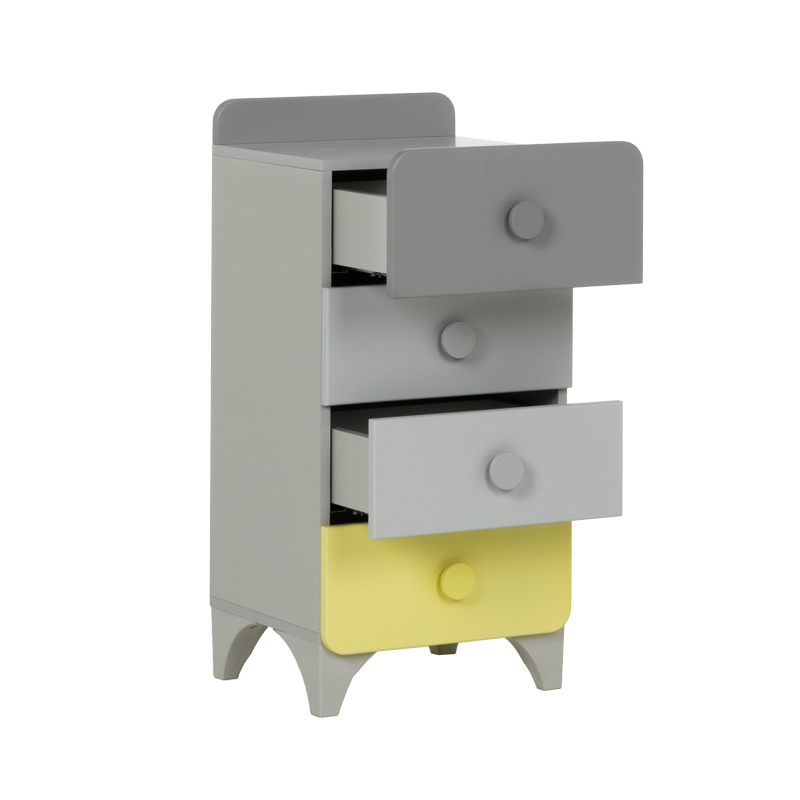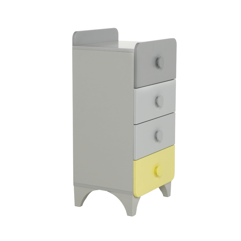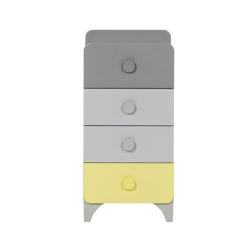 Красивата цветова палитра в нежни нюанси на сиво и жълто създава свеж и приветлив вид, който прекрасно допълва всяко пространство. Сивото придава елегантност и модерност, докато яркият жълт акцент в долното чекмедже добавя игривост и веселие, правейки изделия идеално допълнение за детски стаи или игрални зони.