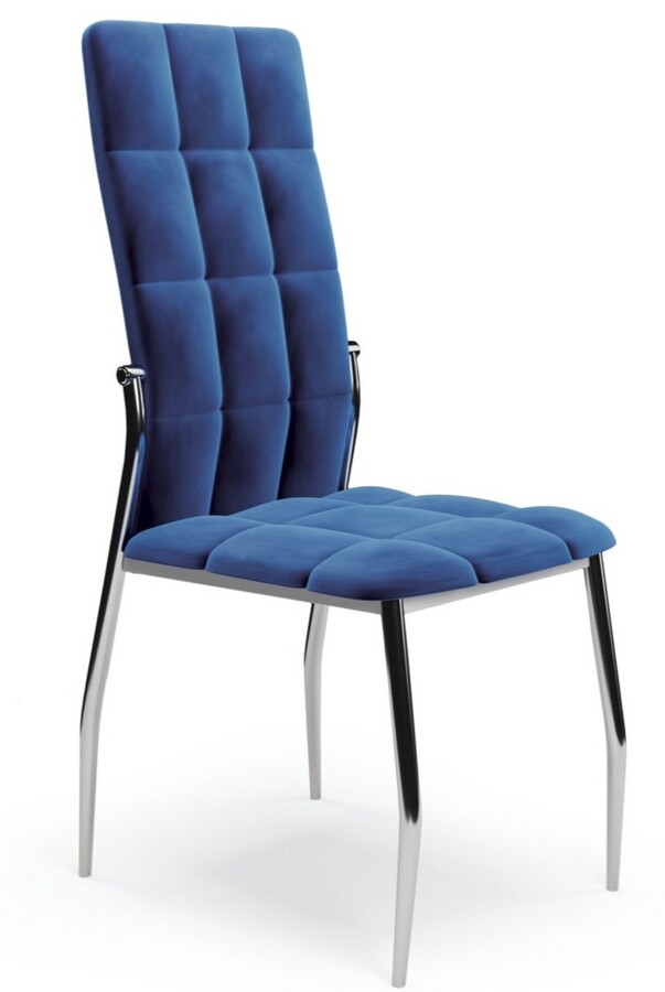 Тъмносиният стол е елегантно оборудване за луксозна трапезария или всекидневна, завършено в бляскав стил. Високото качество на стола е резултат от внимателна изработка и перфектен завършек на дори най-малките детайли.В процеса на производство е използвана кадифена материя,която осигурява удобно седене.Също така се поддържа лесно и изглежда изключително елегантно.Конструкцията на стола е изработена от прахово боядисана стомана в черно.Столът без подлакътници ще добави атрактивен характер към избраното пространство благодарение на геометричните шевове, видими на облегалката. Бодито с висока облегалка ще осигури комфорт