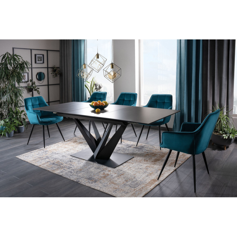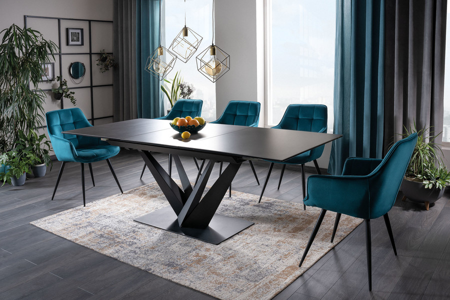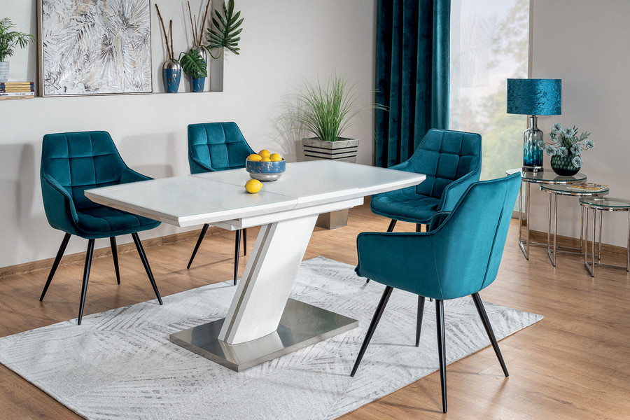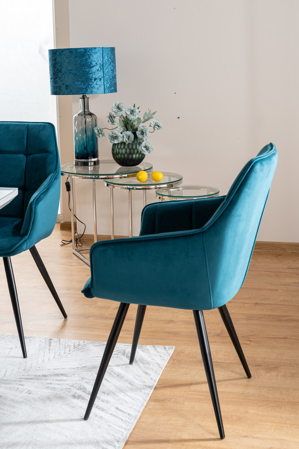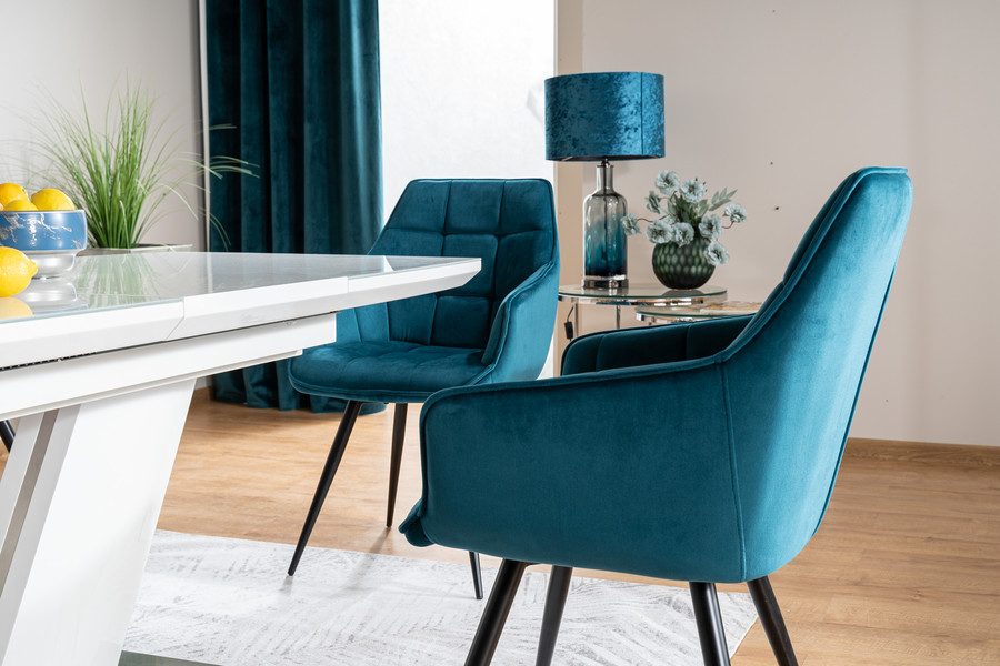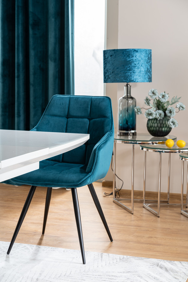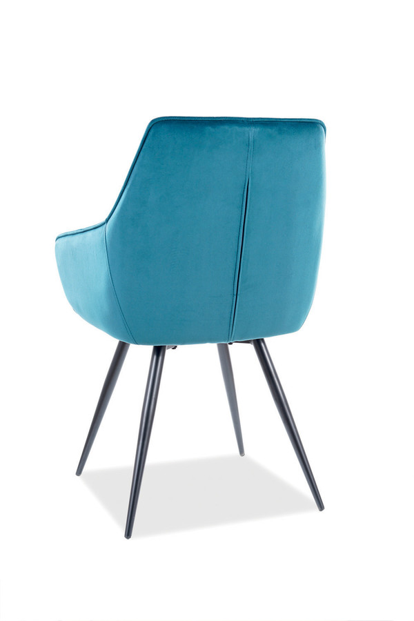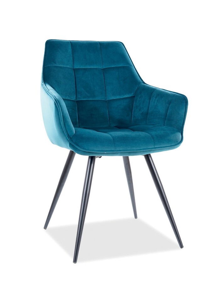 Стол – оригинално парче мебели, което се характеризира с елегантност и грижа за най -малките детайли. Мебелите се основаваха на модерен дизайн, като се вземат предвид фините декорации, благодарение на които тя е не само много практична, но и има декоративна функция в подредбата. Характерът на мебелите позволява да се използва в много интериори, от домашни салони, трапезария и кухня. Тапицираната седалка на стола е свързана директно с облегалката и практичните подлакътници. Тези елементи имат ватиран модел на кариран и производството използва тюркоазен материал, който наподобява кадифе на допир. Тапицираната част от мебелите се основава на четири прави крака, които са изработени от метал и боядисани в черно. Мебелите се предлагат в няколко цветови варианта. Продуктът се доставя на клиента в елементи и изисква собствен монтаж.