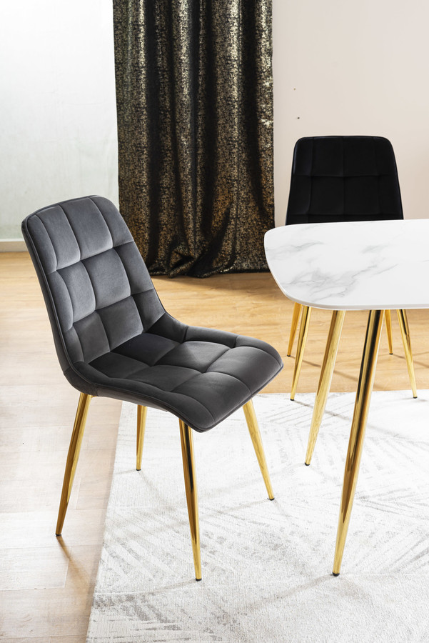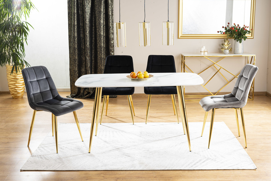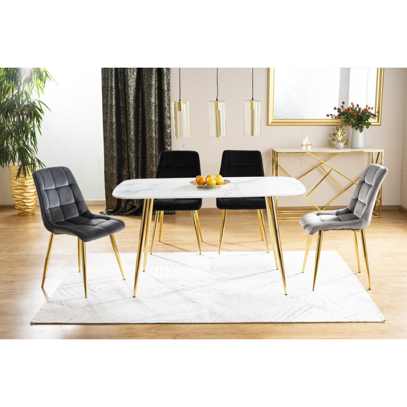 Материал: – плат кадифе: Bluvel 19, – метал: злато, „Bluvel е издръжлива кадифена материя с благороден, лек блясък. Материята има много добра устойчивост на абразия и пилинг. Материалът е лесен за поддържане чист и е одобрен за търговска употреба и OEKO-TEX.