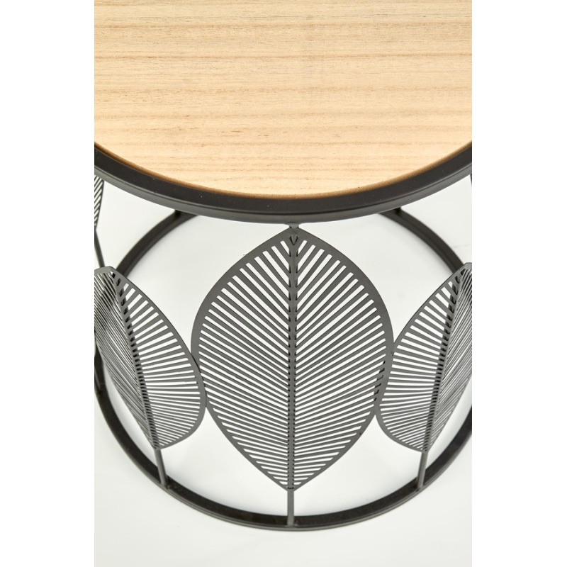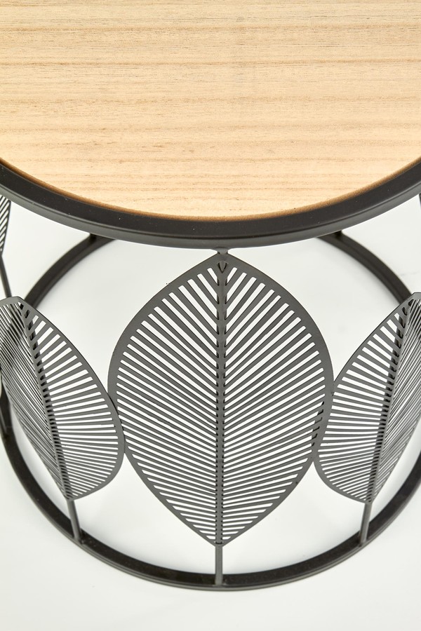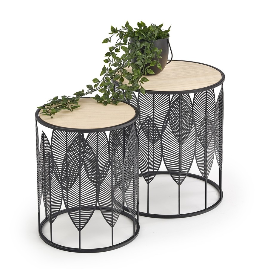 Помощни масички – Представяме набор от две маси, които са идеални за празничното пространство на модерна всекидневна. Кръглите таблици ще донесат на избрания интериор функционалност, комбинирана с аспекта на високата естетика. Кръгли плотове бяха направени от MDF и след това завършиха в естествен нюанс. Стабилната основа от маси с кръгла конструкция с декоративна графика във формата на пера или листа е изработена от прахообразна стомана. Необичаен стил на маси ще донесе уютна атмосфера на интериора, която ще благоприятства за ежедневната почивка. Различните маси могат да се използват заедно или отделно – те са страхотни под формата на маси за кафе или спомагателни маси, на които ще покажем атрактивни декорации или зелени саксийни растения.
