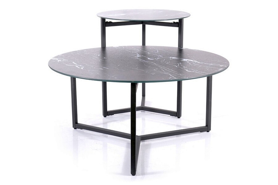 Холна маса – Избирайки набор от пейки, ще добавите оригинален чар, стил и елегантност към вашия салон. Представените таблици изглеждат страхотен комплект заедно, но те също могат да бъдат разделени. Долната скамейка успешно ще изпълни функцията на масичка за кафе, докато по -високата ще бъде перфектна като спомагателна маса. Върховете на представените мебели са изработени от закалено стъкло в оптиката на черен мрамор, докато основите са направени от метал. Изграждането на двете мебели е много интересно и се отнася до индустриалния стил, поради което пейките на Равело ще се адаптират перфектно към модерен, таванско помещение и дори бляскав стил.