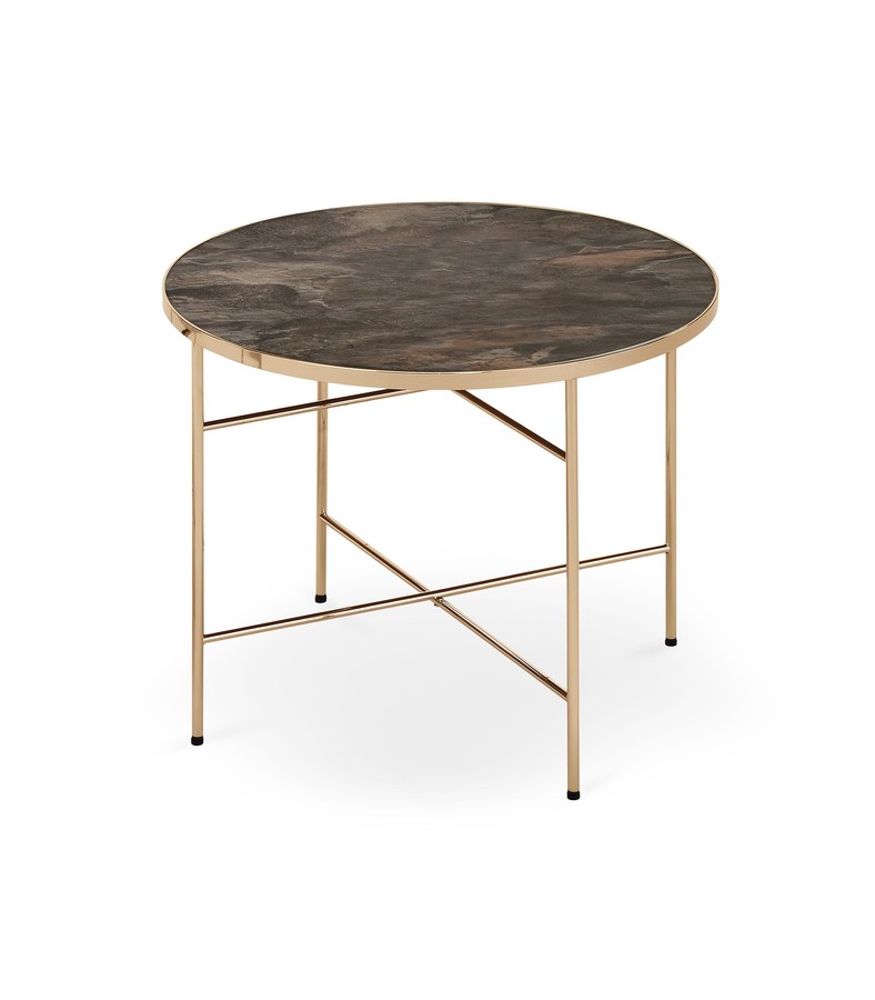 холна маса – мебел, предназначен за хора, които ценят елегантния стил. Представената структура ще бъде перфектно открита в интериора на сядане, например салон, подреден в блясък или модерна естетика. Кръгъл връх е изработен от тъмно мраморно стъкло, което нежно контрастира с обикновена хромирана стоманена рамка и завършена в златист цвят. Основата на мебелите е допълнена с малки крака, което гарантира стабилността и издръжливостта на мебелите. Пейката в декора на тъмния мрамор не само ще бъде практична мебел при ежедневна употреба, но и подчертава естетиката на стаята, въвеждайки аспекта на лукса и вечната елегантност към нея.