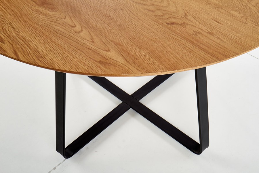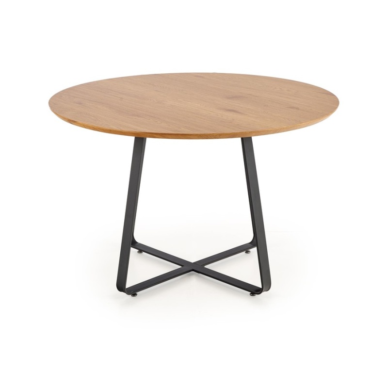 Масата е модерна конструкция с кръгъл плот с диаметър 120 см. Неразтегателната маса може да побере 4 до 6 души. Мебелите са поставени върху големи кръстосани плъзгачи, изработени от прах- стомана с покритие Кръглата маса е изработена от МДФ фурнир плоскост в цвят златен дъб, върху който се вижда естествената зърнистост.Декорът златен дъб ще внесе топъл акцент в стаята, който ще предразполага към релакс.