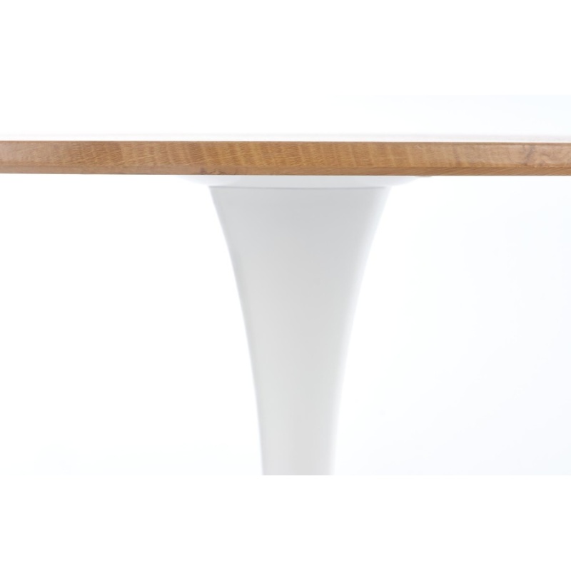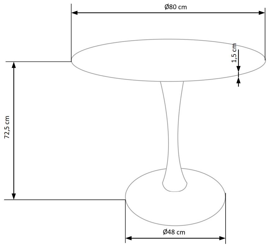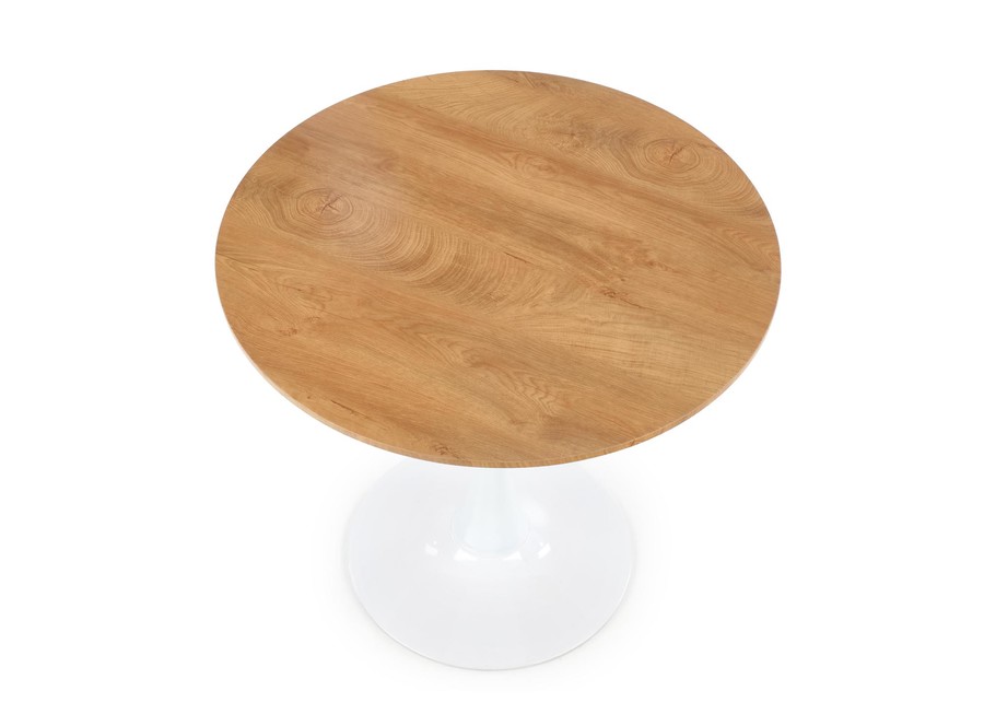 Трапезна маса – модел с кръгъл плот, чийто диаметър е 80 cm. Неодобрена маса с модерен външен вид е мебел, който лесно може да се побере от двама до четирима души. Масата за ужилване е страхотна дори в малки стаи, защото няма да отнеме ценно полезно пространство. Кръгъл плот е създаден MDF, който е траен материал, има повишена устойчивост на незначителни механични увреждания и е лесен за почистване. Топ от 4 човека се предлага в декор с естествено дърво, върху който се вижда естествено зърно. Моделът поставен върху рамка под формата на колона, която завършва с кръгла основа, която гарантира стабилността и солидността на мебелите. Основата беше изработена от стомана, покрита с прах. Представената таблица е предназначена за самосглобяване.