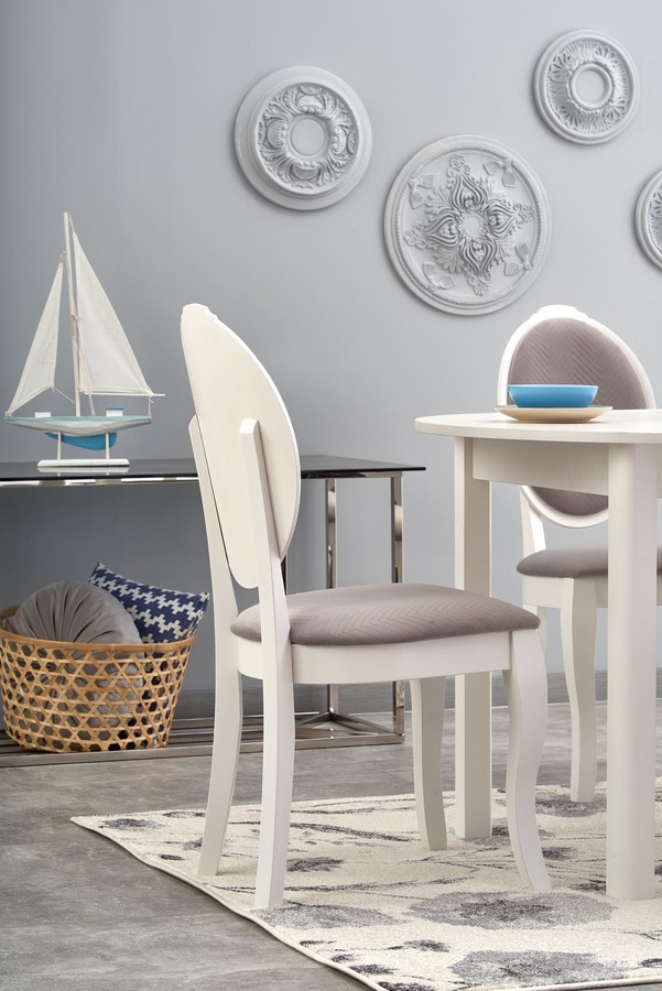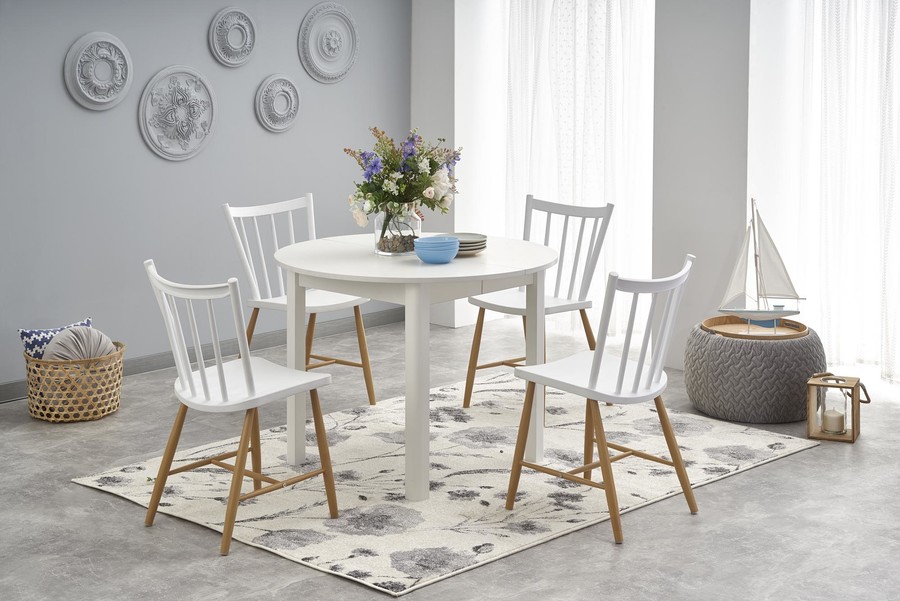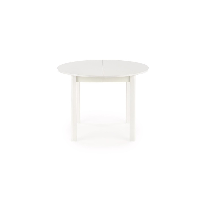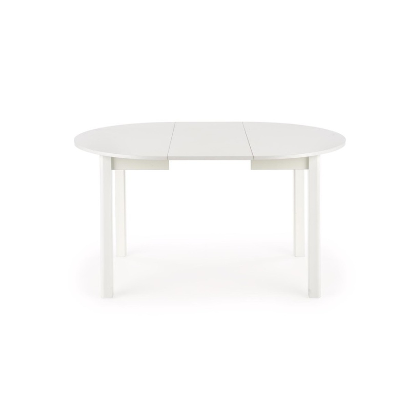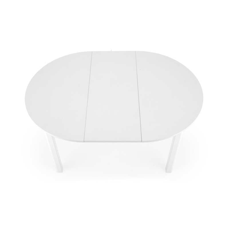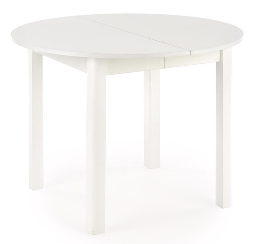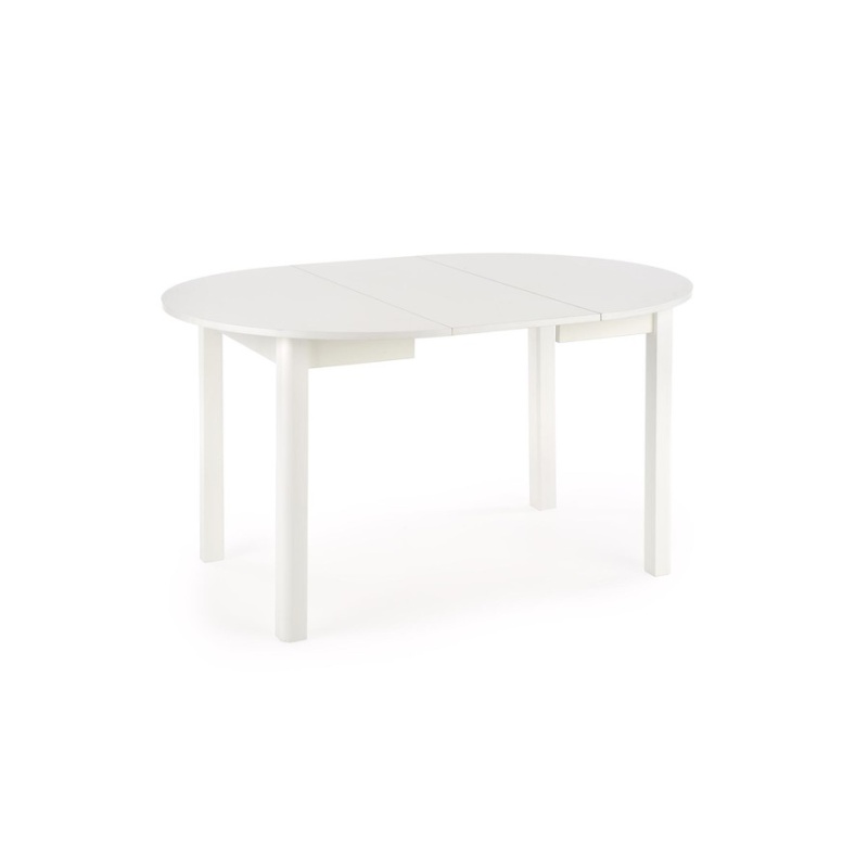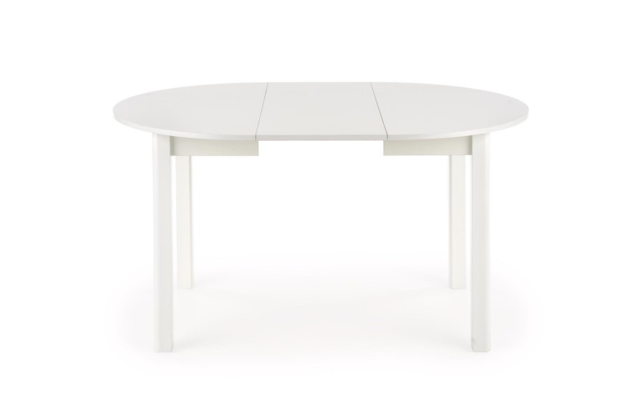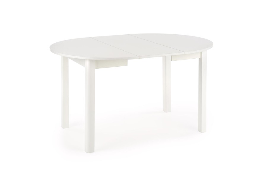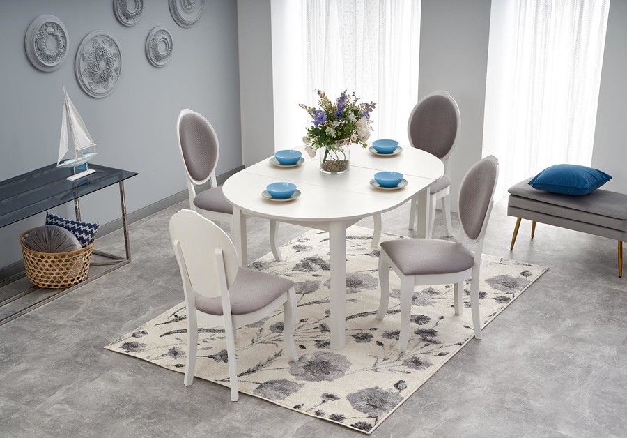 Трапезна маса – Таблицата с бяло сгъване е оформен блок с диаметър на плота от 102 cm. От своя страна, след разгръщането си, таблицата получава размери от 142 × 102 cm. След разгръщане, горната част на масата прилича на овал, благодарение на който ще се побере от четири до шест души. Просторният връх е създаден от мебелна дъска за фурнир, докато четири прави крака са направени от материали от MDF в фурнир. Полски производствена маса с кръгла горна форма е идеална за апартаменти с малка полезна зона. Нещо повече, по време на ежедневната употреба масата ще може да остане сложна, докато по време на посещението на гости можете бързо и ефективно да я разпространявате в по -големи размери. Таблицата е предназначена за самосглобяване.