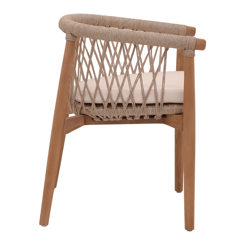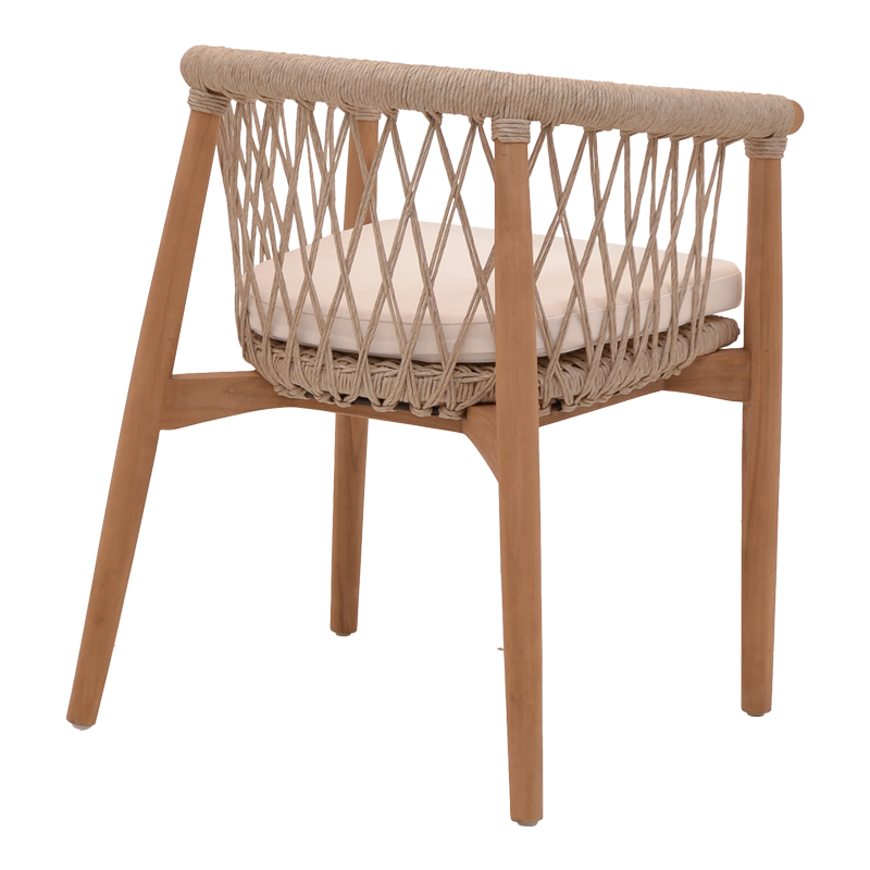 Конструкцията е стабилна и надеждна, изработена от висококачествени дървени материали, известни със своята здравина и дълготрайност. Цветът на продукта е топъл и естествен, което го прави лесно съвместим с различни интериорни стилове. Комбинацията от естествени тонове и текстурата на плетката създават топла и уютна атмосфера, идеална както за дневната, така и за терасата.