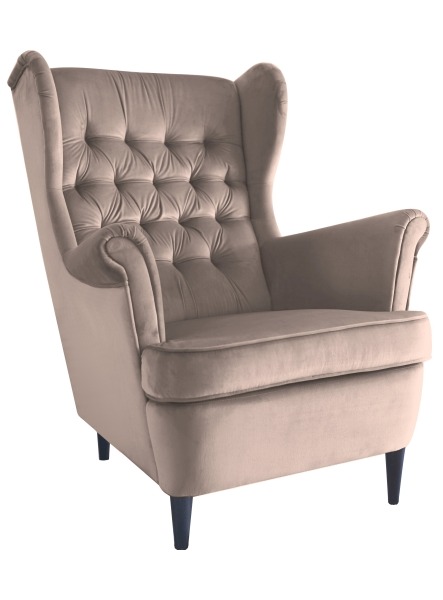 Кресло – модерна, елегантна версия наушите. Мебелите се характеризират с изключително висок гръб, който поддържа гръбначния стълб и главата, за да се направи дори дълготрайна седнала позиция. Отстрани се добавя цялата дължина, както и високи и леко огънати, заоблени подлакътници, които ще държат ръцете си в правилното положение. Въз основа на стилни бутони, които създават елегантна структура, бяха пришити. Мебелната седалка е оборудвана с допълнителни възглавници, които ги правят още по -меки. Цялото е вградено на крака на средна височина, наподобяващи обърнати конуси. Черните (Wenge) краката на стола са изработени от дърво, докато използваемата част беше покрита с тапицерия, изработена от бежово кадифе. Мебелите ще съчетаят перфектно стилната всекидневна, превръщайки се в място за четене на книги и гледане на телевизия, както и в спалнята като стол за релакс. Мебелите са чудесно място за всяка (по -къса и по -дълга) дрямка.