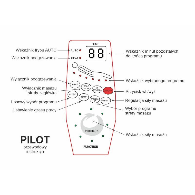 – Масажните функции, регулируеми с помощта на кабелно дистанционно управление, в опцията: работно време, отопление, избор на зона и интензивност на масажа