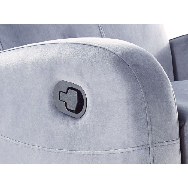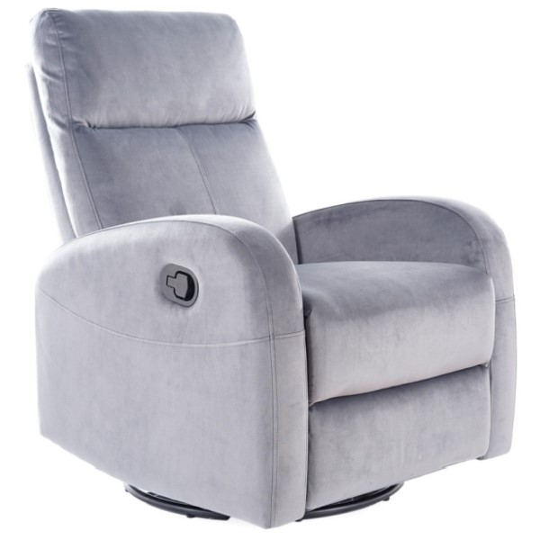 Релакс кресло – Креслото на сгъването на кадифе е функционално, дизайнерско парче мебели, идеално за любителите у дома. Това е масивна седалка с функция за релакс и разгръщане, идеална за модерна всекидневна, спалня или луксозни апартаменти. Креслото ще работи както като диван по време на следобедната сиеста, така и място за уморени гости. С помощта на странична дръжка можете да издърпате краката и да намалите облегалката до полуизвестната позиция. Тапицерията на стола е приятна на пипане, мека тъкан в сиво, покриваща мебелите изцяло, включително облегалката и подлакътниците. Светлосивият нюанс озарява интериора и върви добре с останалите елементи на оборудването.