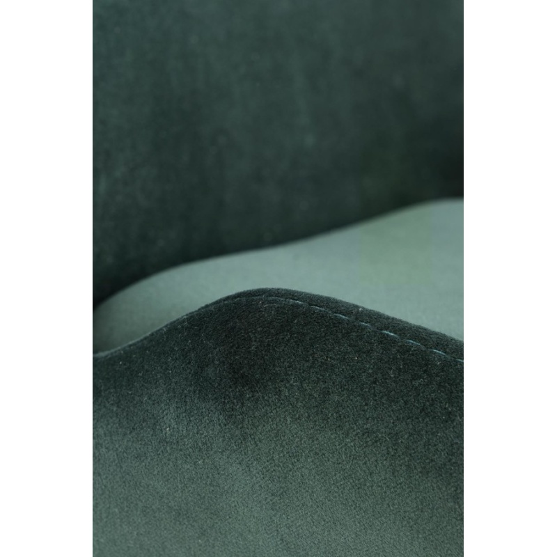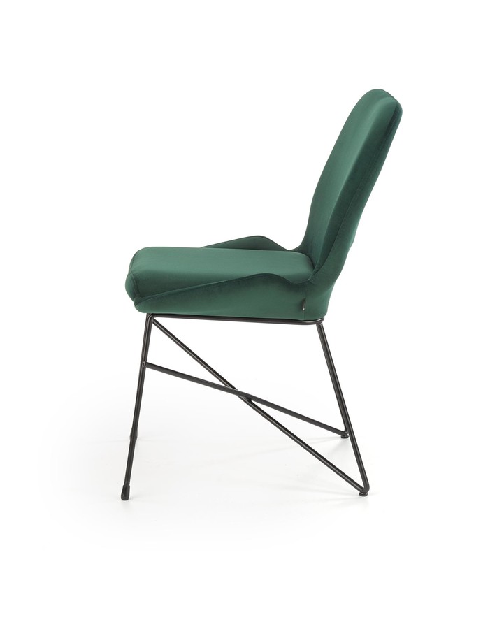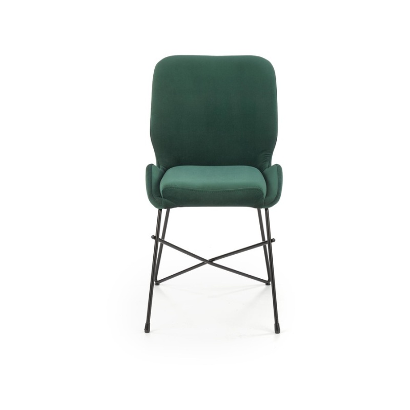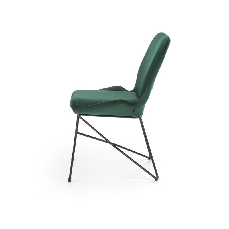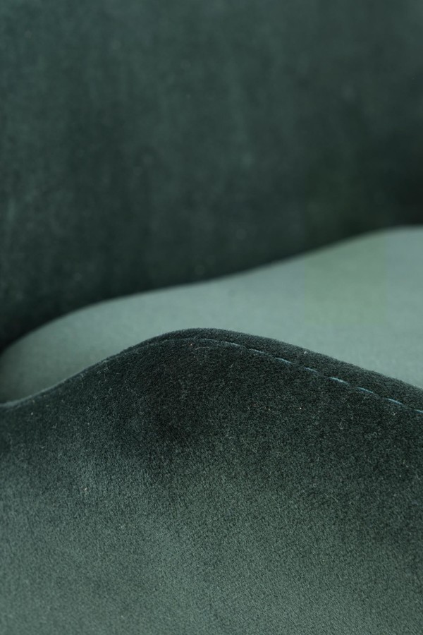 Тъмнозелено кресло без подлакътници е модернистична форма, която привлича погледа с простата, почти минималистична си линия. Субтилно профилираната облегалка е комбинирана с малки страни, които освен практическата функция, придават на мебела оригинална естетика. Креслото е завършено с мека подложка на седалката, която осигурява удобно седене, така че дори продължителното използване да не създава дискомфорт. Българско производство, креслото с умерена височина на облегалката е тапицирано с кадифена тъкан в тъмнозелено. Материалът, използван в производствения процес на модерния модел, не само изглежда ефектно, но и има увеличена устойчивост на замърсявания и е приятен на допир, което значително увеличава комфорта на почивката. Зеленото кресло е разположено на стегнати крачета, изработени от стомана, боядисана с прахова боя в черен цвят. Моделът е предназначен за самостоятелен монтаж.