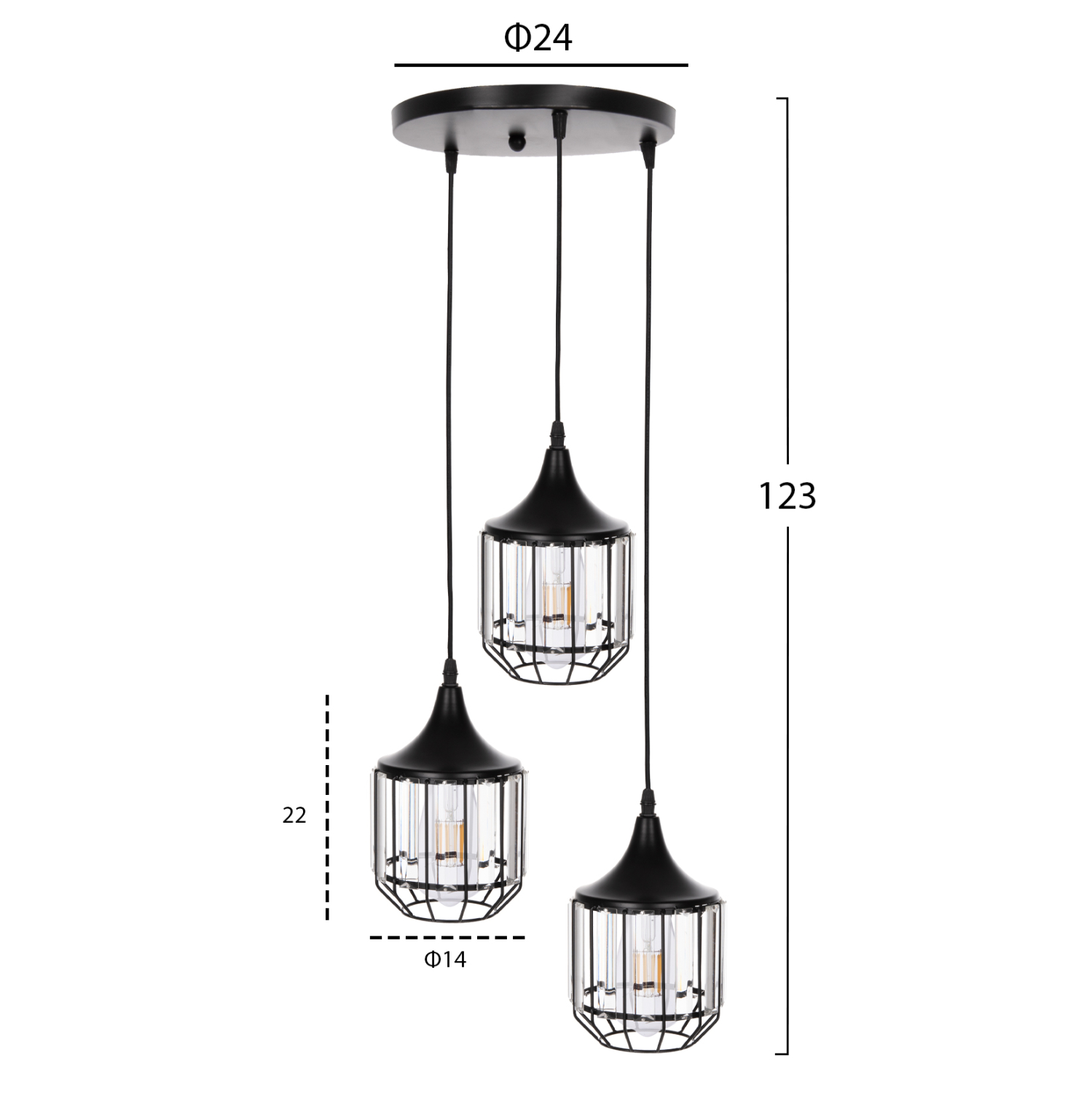 Това красиво осветително тяло ще преобрази всяко помещение с изтънченост и стил. Създадено с внимание към детайла, този продукт се откроява с неговия индустриален дизайн, който съчетава елегантност и модернизъм. Три висищи лампи, обвити в черни, метални рамки с геометричен мотив, придават на всяко пространство уникална визуална привлекателност. Прозрачните абажури осигуряват оптимално разпределение на светлината, създавайки уютна и приветлива атмосфера.