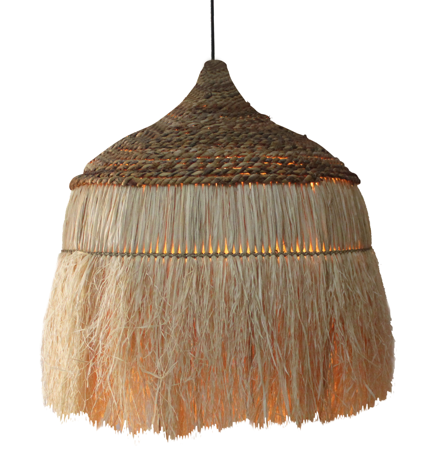 Този продукт акцентира на ръчно изработения шапкаобразен абажур, изтъкан от фини влакна, които добавят мека и топла светлина. Материалите гарантират дълготрайност и същевременно предлагат лекота, което го прави подходящо за различни приложения – от хола до спалнята или трапезарията.