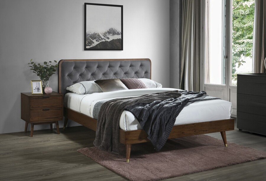 Тапицирано легло – е комбинация от елегантен стил с над средната функционалност. Леглото със съня повърхност от 160 × 200 см е направено от твърда гумена дървесина с добавяне на MDF и естествен фурнир. Перфектният завършек на тези материали е гаранция за дългогодишна употреба, както и удобен сън. Леглото ще бъде декорацията на спалнята само по себе си благодарение на тапицираната табла, която е тапицирана с кадифена тъкан в сив нюанс – допълнително е ватирано, за да увеличи елегантния стил на мебелите. Таблото е практичен елемент на леглото, на което можете да разчитате свободно, докато четете или гледате филми преди лягане. Моделът е завършен в доста универсални цветове, съчетавайки тъмно сиво с естествено оцветяване на дърво, благодарение на което той ще работи както в модерен, така и в подреден скандинавски стил. Предлага се двойно легло без матрак. Ниските и заоблени крака бяха завършени със злато в златен цвят, които дават целия оригинален характер.