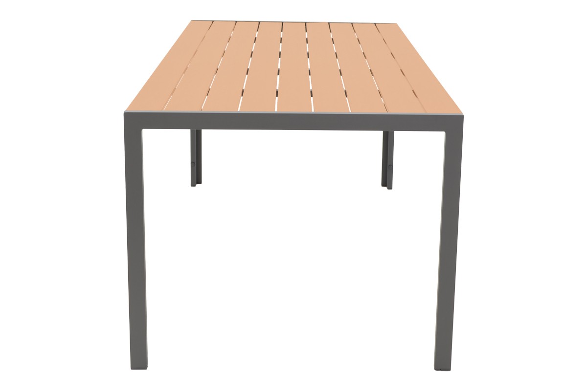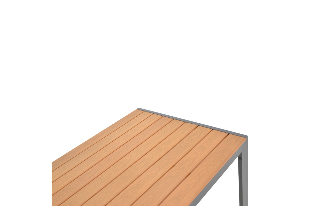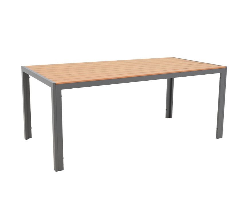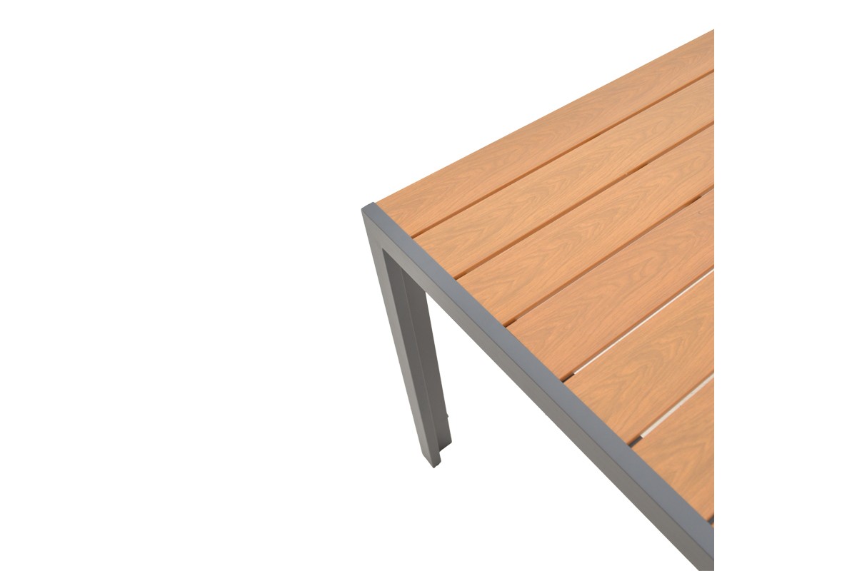 Стабилността на тази маса е резултат от издръжливата конструкция и здравата основа. Топът на масата е в топъл и привлекателен нюанс, наподобяващ натурално дърво, който създава усещане за уют и хармония. Цветът добавя топлина и класическо излъчване, което идеално се вписва в различни стилове на открито обзавеждане – от модерни до традиционни.