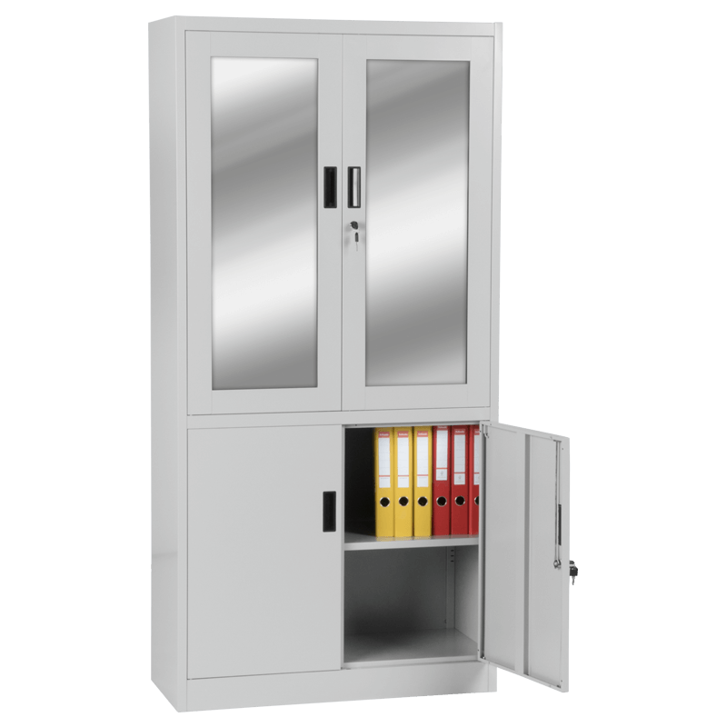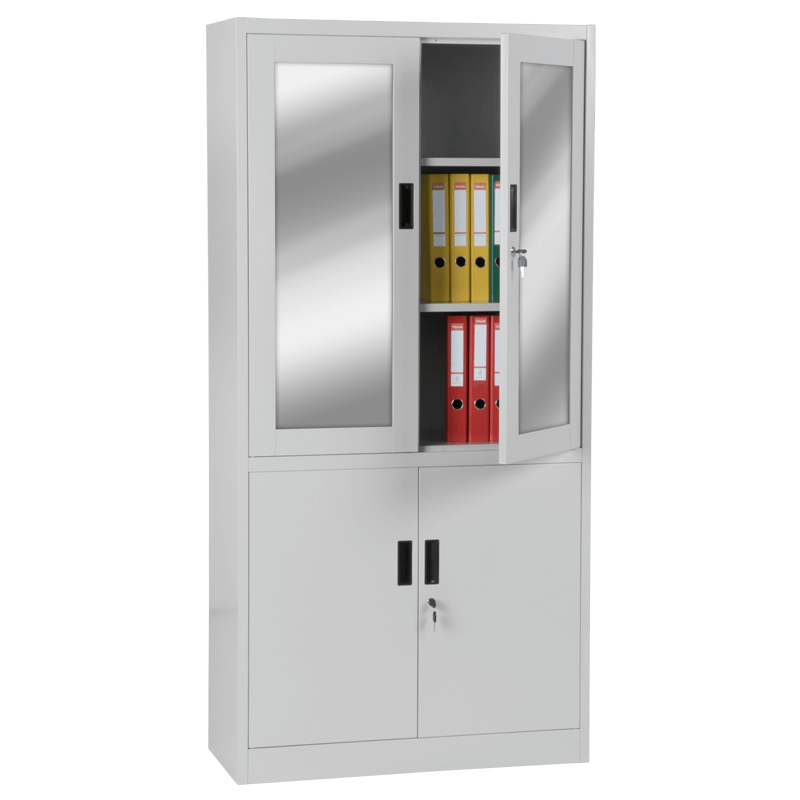 Метален шкаф CR-1272 LM – елегантно и практично решение за всеки офис или дом. Този стилен шкаф е изработен от висококачествен метал, което гарантира дълготрайността и здравината на продукта. Със своите две горни врати, оборудвани с прозрачни стъклени панели, той предоставя практично решение за съхранение и излагане на документи и материали, които трябва да бъдат видими, но и добре защитени.