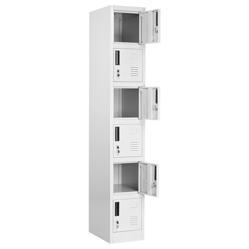 Метален шкаф от серията метални шкафове разполага с шест отделения с метални вратички към тях. Металният гардероб от този тип позволява съхранение на малък багаж, лични вещи и документи. Серията от метални мебели включва офис контейнери, метални гардероби за съблекалня, метални контейнери, метални шкафове, предназначени за документи, кардекс и други.