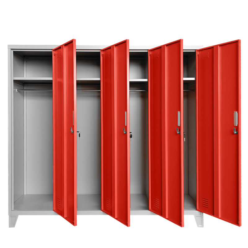 Металният гардероб с четири плътни врати предлага практично решение за съхранение. Вратите се заключват с ключ, осигурявайки безопасност за личните вещи. Всеки от разделите е оборудван с рафт, който има товароносимост до 40 кг, вграден лост за закачалки и вентилационен отвор за оптимална циркулация на въздуха. Удобните 10 см крака улесняват почистването под шкафа, което го прави идеален избор за детски градини. За пълна информация относно размерите и характеристиките на продукта, моля, консултирайте се с таблицата в таб/поле ‘Техническа информация’.