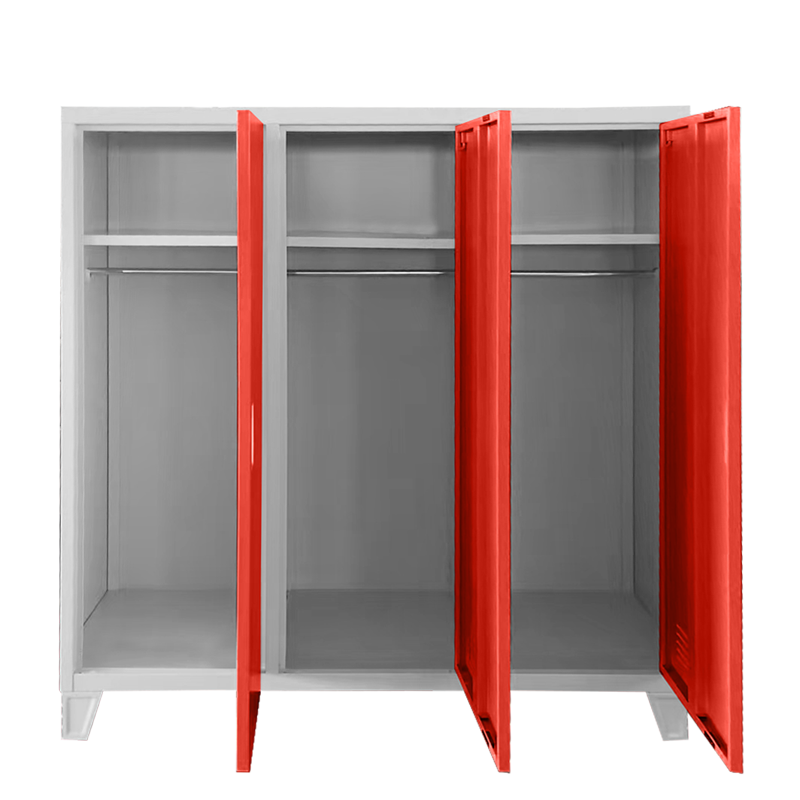 Металният шкаф е троен гардероб с три плътни врати, затварящи се с магнитна система. Всяко отделение разполага с рафт с товароносимост до 40 кг, вграден лост за закачалки и вентилационен отвор за добра циркулация на въздуха. Моделът е с крака с височина 10 см, което улеснява почистването под шкафа. Изработен е от праховобоядисан метал с грапаво-шагрен покритие и е подходящ за оборудване на детски градини. Пълна информация за размерите и характеристиките можете да намерите в таблицата в таб/поле ‘Техническа информация’.