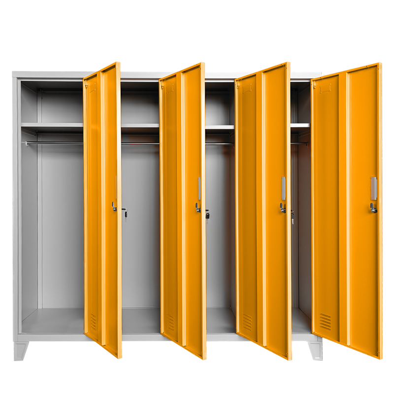 Металният гардероб с четири плътни врати предлага практично решение за съхранение. Вратите се заключват с ключ, осигурявайки безопасност за личните вещи. Всеки от разделите е оборудван с рафт, който има товароносимост до 40 кг, вграден лост за закачалки и вентилационен отвор за оптимална циркулация на въздуха. Удобните 10 см крака улесняват почистването под шкафа, което го прави идеален избор за детски градини. За пълна информация относно размерите и характеристиките на продукта, моля, консултирайте се с таблицата в таб/поле ‘Техническа информация’.