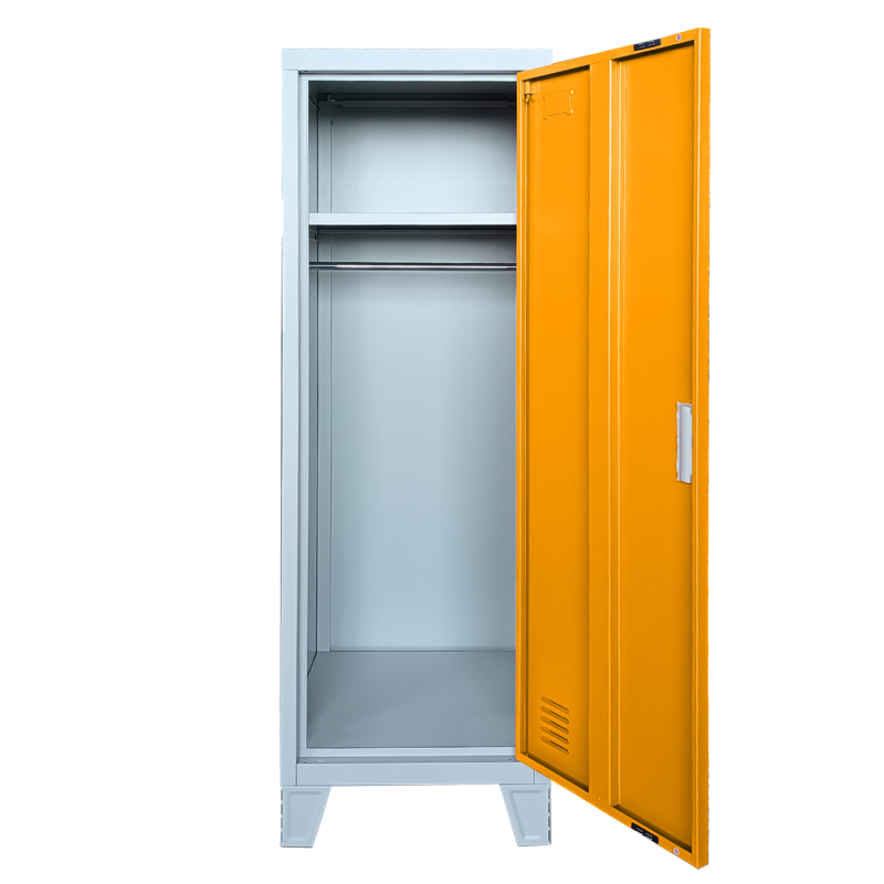 Метален шкаф с единичен дизайн и плътни врати, които се затварят с магнитна система. Отделението включва рафт с товароносимост до 40 кг, вграден лост за закачалки и вентилационен отвор за добра циркулация на въздуха. Моделът е снабден с крака с височина 10 см, които улесняват почистването под шкафа. Изработен е от праховобоядисан метал с грапаво-шагрен покритие, което осигурява дълготрайност и устойчивост. Подходящ е за оборудване на детски градини. Пълна информация за размерите и характеристиките на модела ще намерите в таблицата в секцията ‘Техническа информация’.