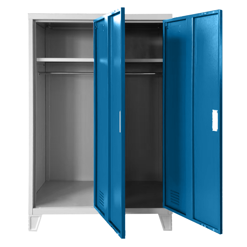 Метален шкаф е двоен гардероб с две плътни врати, които се затварят с магнитна система. Всяко отделение разполага с рафт с товароносимост до 40 кг, вграден лост за закачалки и вентилационен отвор за добра циркулация на въздуха. Моделът е снабден с крака с височина 10 см, които улесняват почистването под шкафа. Изработен е от праховобоядисан метал с грапаво-шагрен покритие и е подходящ за оборудване на детски градини. Пълна информация за размерите и характеристиките на модела ще намерите в таблицата в таб/поле ‘Техническа информация’.