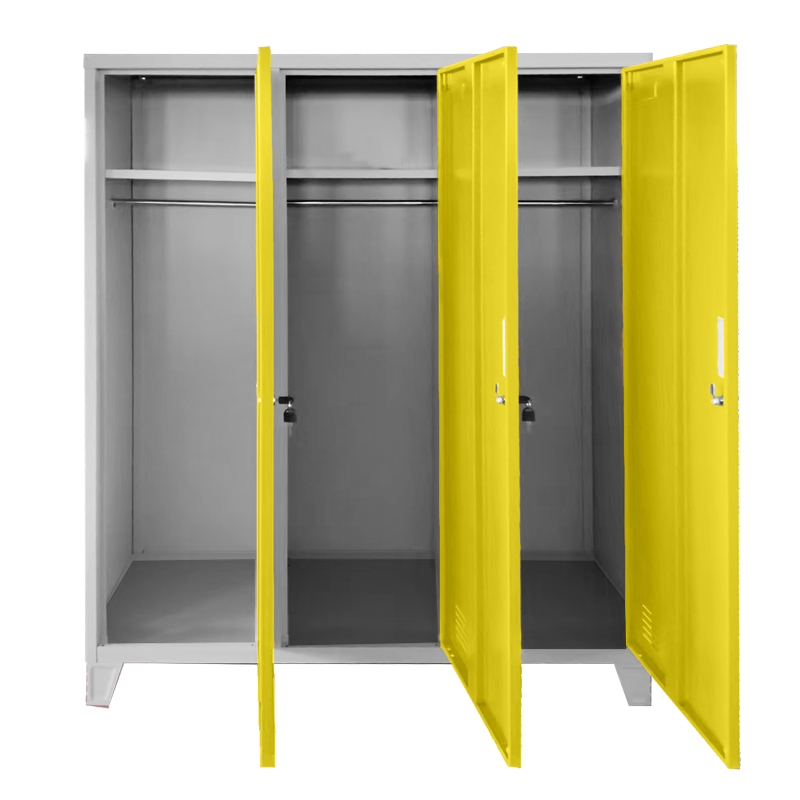 Метален шкаф с три плътни врати, които се заключват с ключ. Всяко отделение е оборудвано с рафт с товароносимост до 40 кг, вграден лост за закачалки и вентилационен отвор за по-добра циркулация на въздуха. Моделът разполага с крака с височина 10 см, което улеснява почистването под шкафа. Идеален е за оборудване на детски градини. Подробна информация за размерите и характеристиките можете да намерите в таблицата в раздела ‘Техническа информация’.