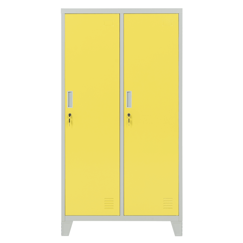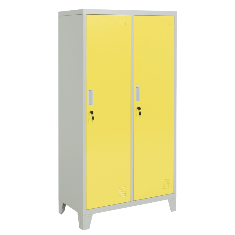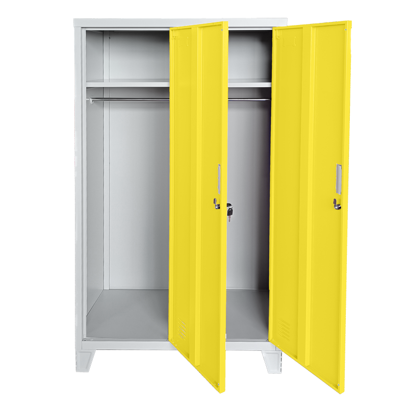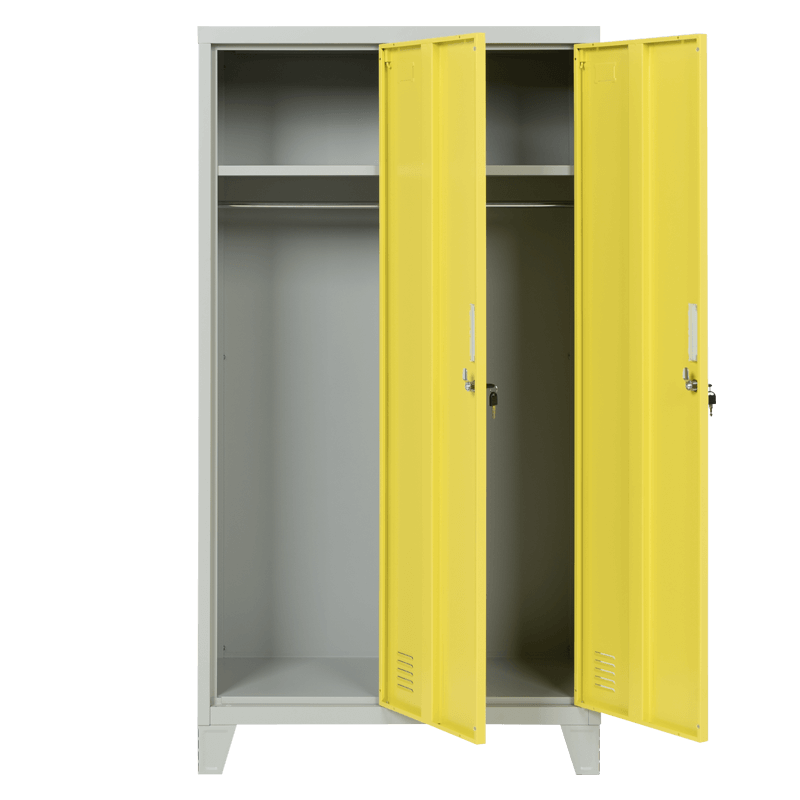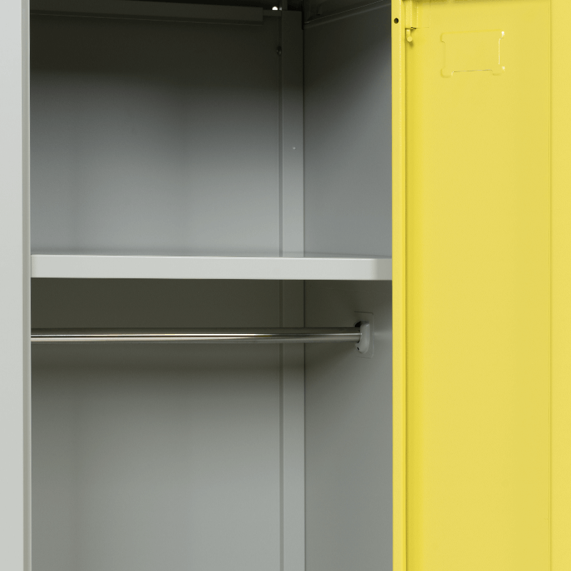Двойните врати осигуряват удобен достъп до вътрешността, а интегрираната система за заключване гарантира безопасността на съхраняваните вещи. Шкафът е проектиран с внимание към детайла, което го прави не само функционален, но и естетически приятен. Минималистичният дизайн в комбинация с яркия цвят предизвиква положителни емоции и придава модерен вид на помещението.