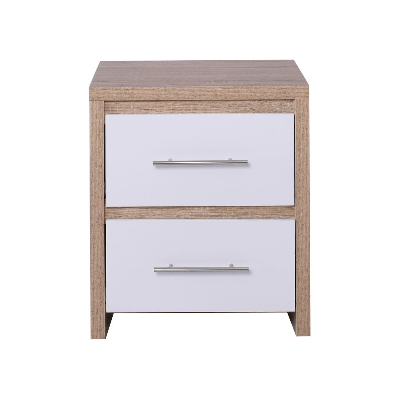 Основният цвят е елегантен светъл дъб, който придава топлина и уют на всяко помещение. Контрастните бели фронтове на чекмеджетата добавят модерен акцент, който допълнително обогатява интуитивната естетика на комода. Чекмеджетата са оборудвани с издръжливи метални дръжки, осигуряващи лесен достъп и допълнителен комфорт.