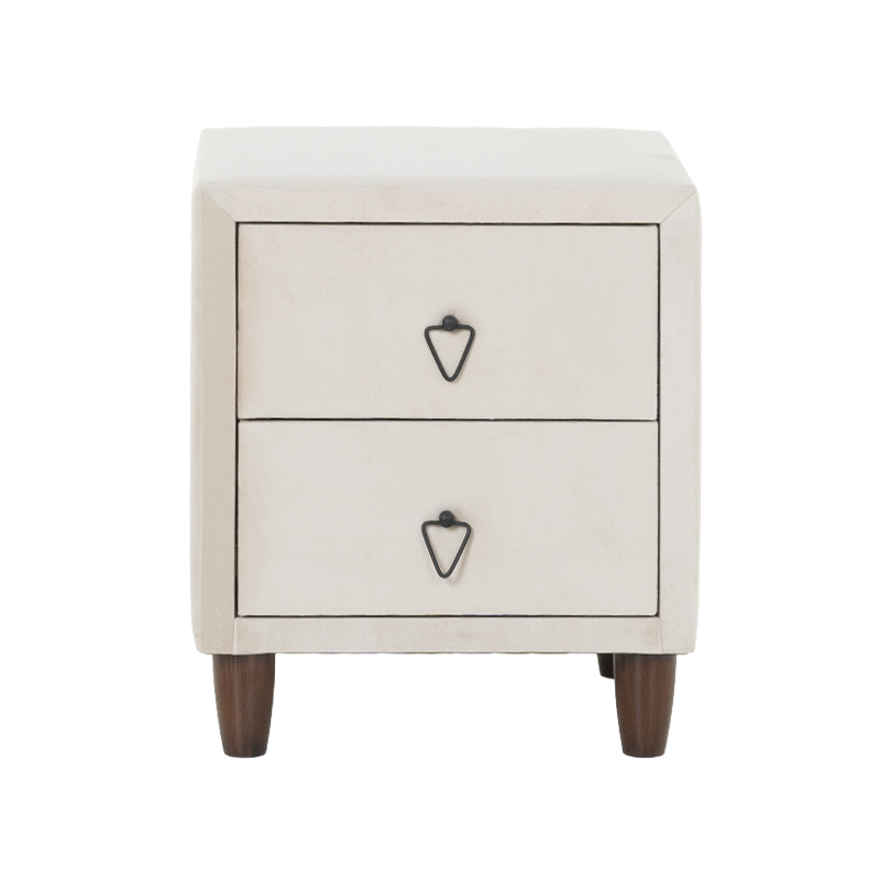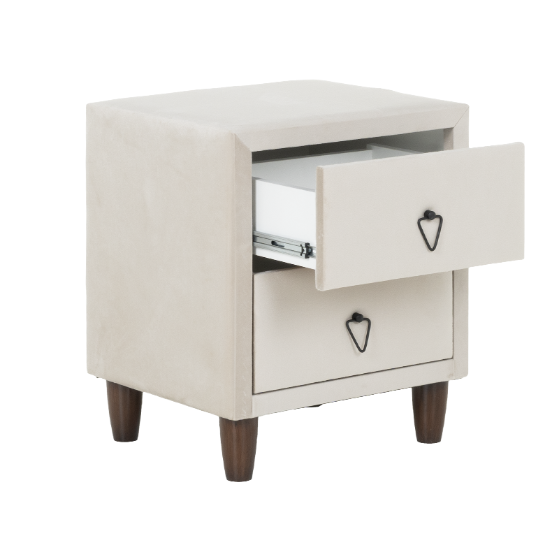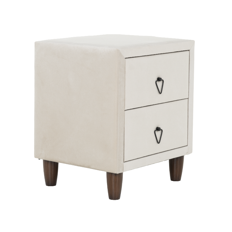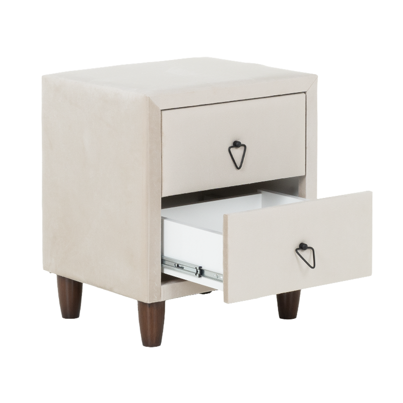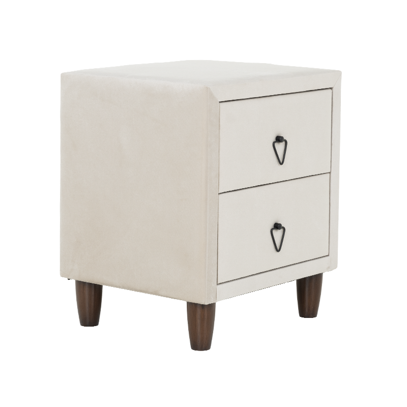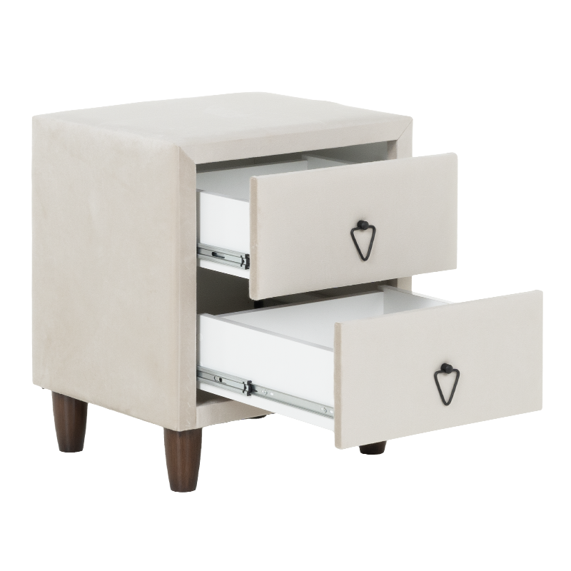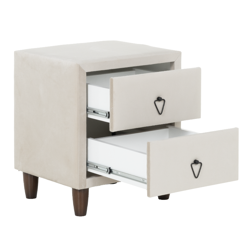 Шкафчето се отличава с изискан кремав цвят, който внася усещане за спокойствие и уют в интериора на вашето помещение. Нежните му и фини линии създават впечатление за лекота, а същевременно осигуряват необходимото пространство за съхранение. Дизайнът е подобрен с две удобни чекмеджета, идеални за съхранение на лични вещи, книги или други предмети, които искате да имате под ръка.