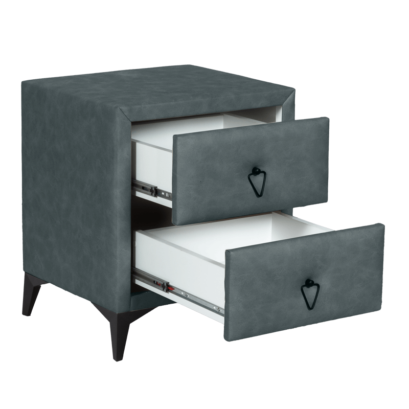 Нощното шкафче е перфектното допълнение към всяка спалня или друго тапизирано легло. То е изработено от ПДЧ, покрито с дамаска, и разполага с елегантни метални крака в черен цвят. С двете чекмеджета с плавно затваряне, ще се насладите на максимално удобство. Пълната информация за размерите и характеристиките на модела можете да намерите в таблицата в секция „Техническа информация“.