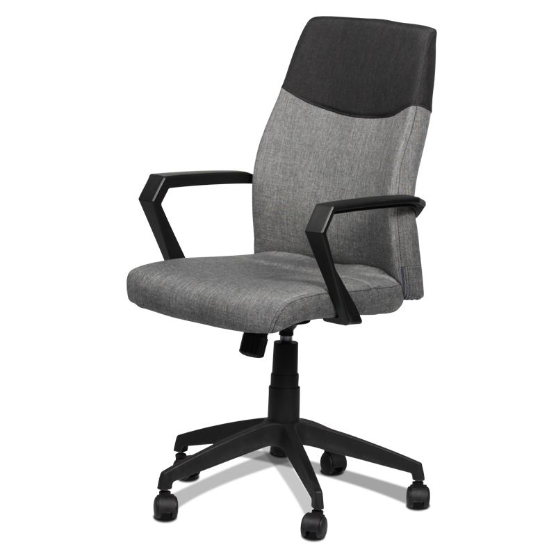 Изработен от висококачествени материали, столът осигурява дълготрайност и устойчивост във времето. Ергономичната му форма осигурява оптимална поддръжка на гърба, благодарение на меката възглавница и удобната облегалка, обвити в стилен сив текстил. Вградените подлакътници спомагат за правилната позиция на ръцете, което намалява напрежението и умората по време на работа.