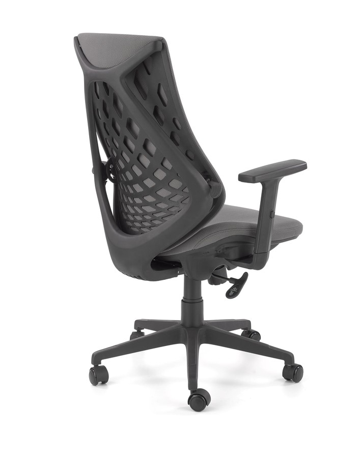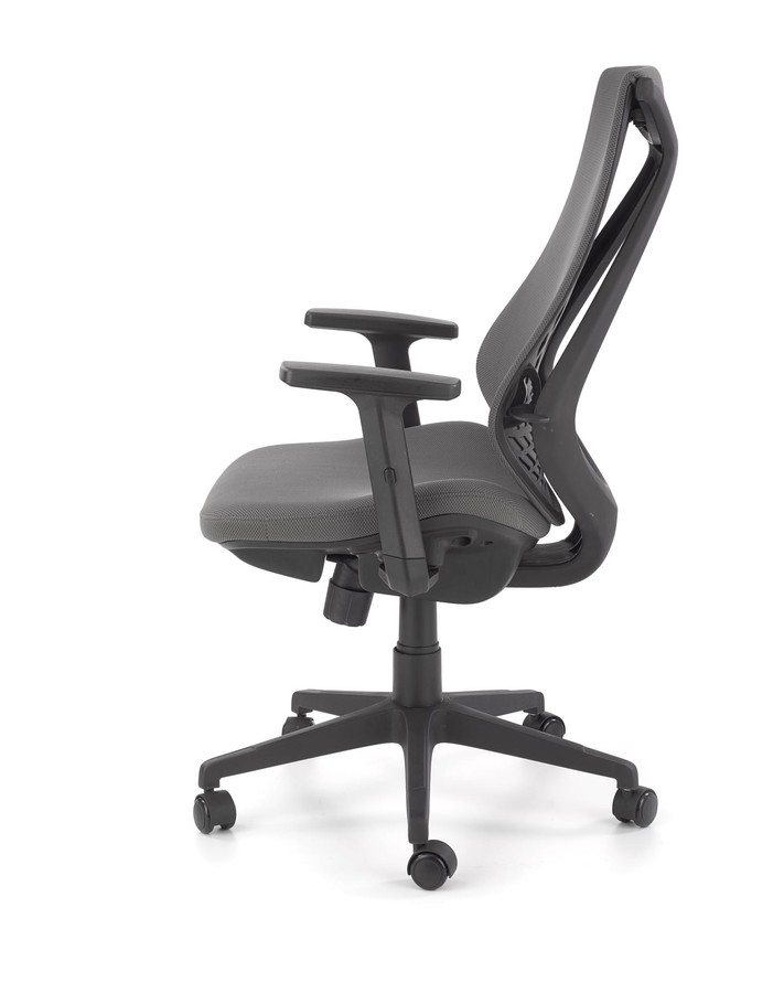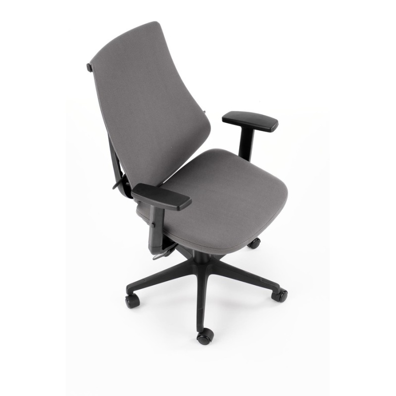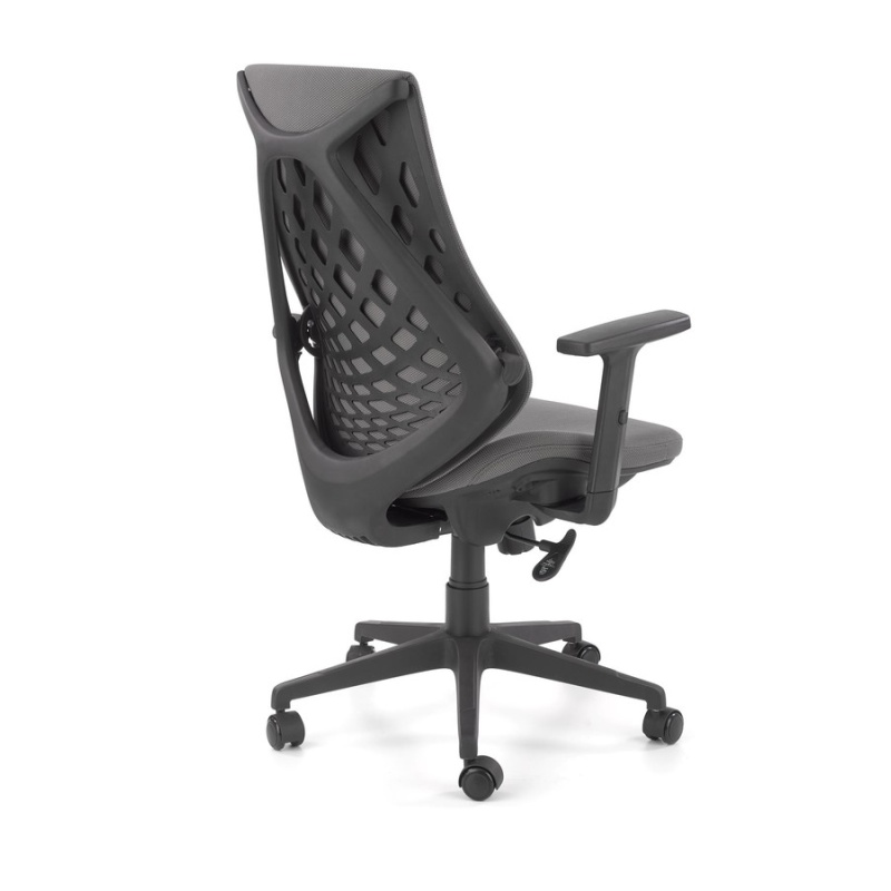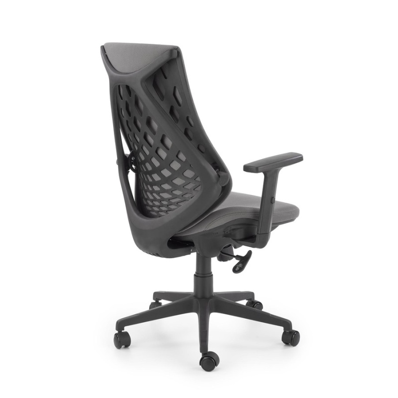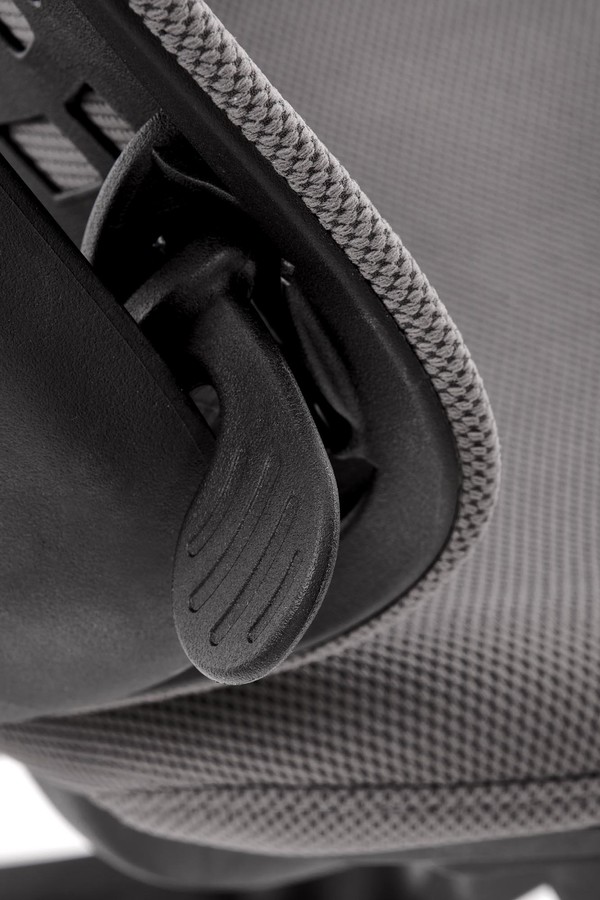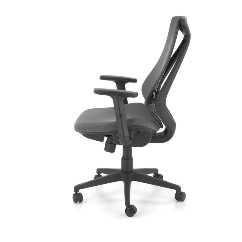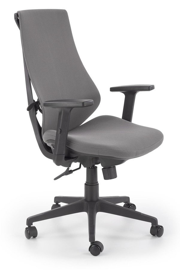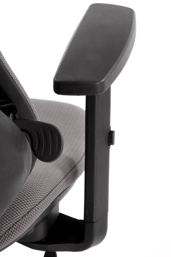 Столът с подлакътници ще се хареса на любителите на ергономични и минималистични решения. Представеният стол ще бъде напълно намерен в уговорката на частен офис или офис. Чистният стол се поставя на базата на кръстосано оформено, което беше завършено с пътни колела, като максимално увеличава мобилността на конструкцията. Неплатеният стол на шкафа е изработен от черен полипропилен и сива тъкан, който е мек материал на допир и в същото време е лесен за поддържане на чисти. Стола с регулируеми подлакътници е оборудван с механизъм на наклона, който ще ви позволи да адаптирате мебелите към индивидуалните нужди и предпочитания на потребителя.