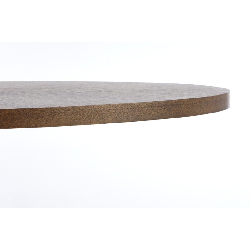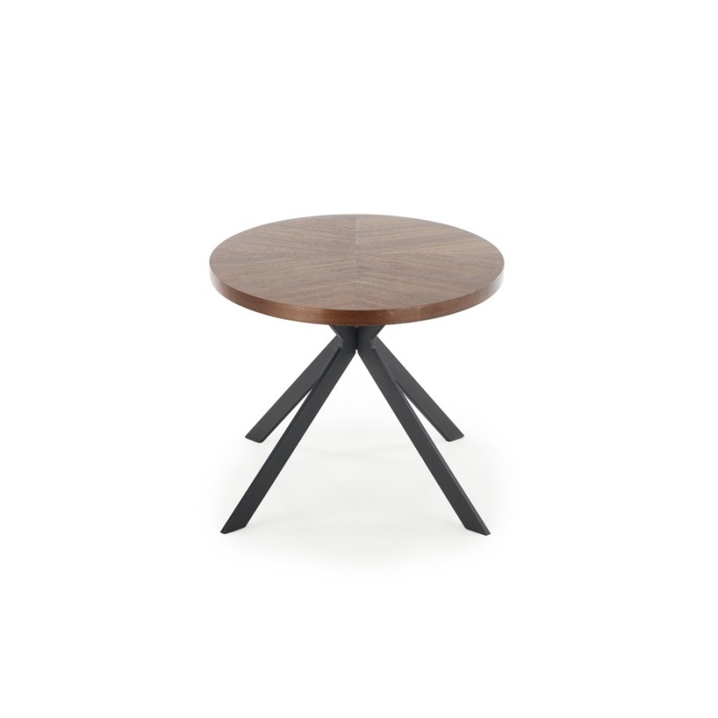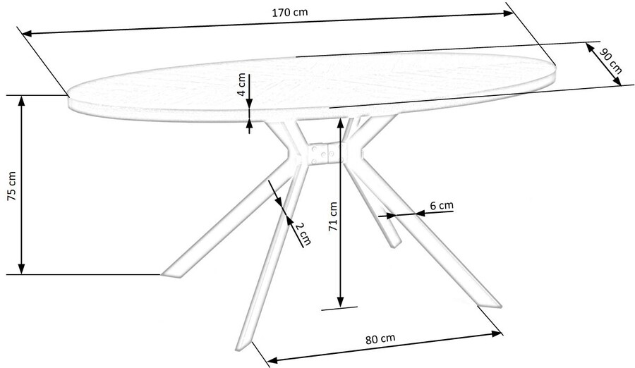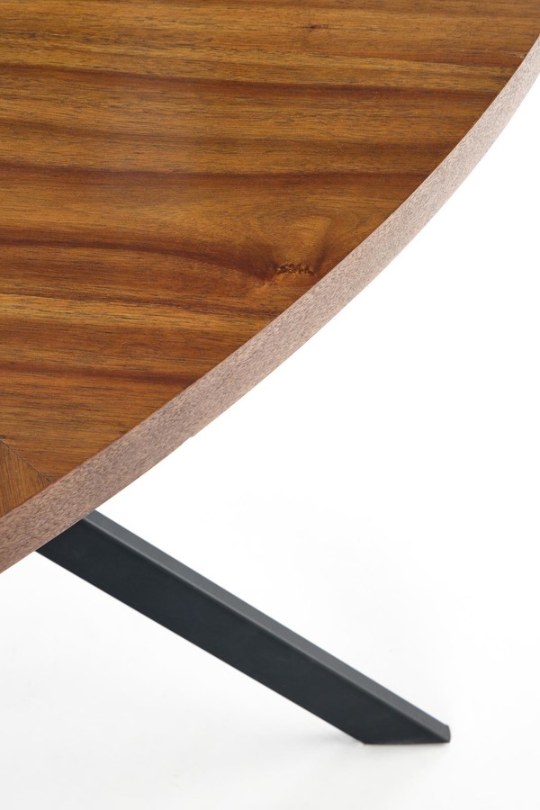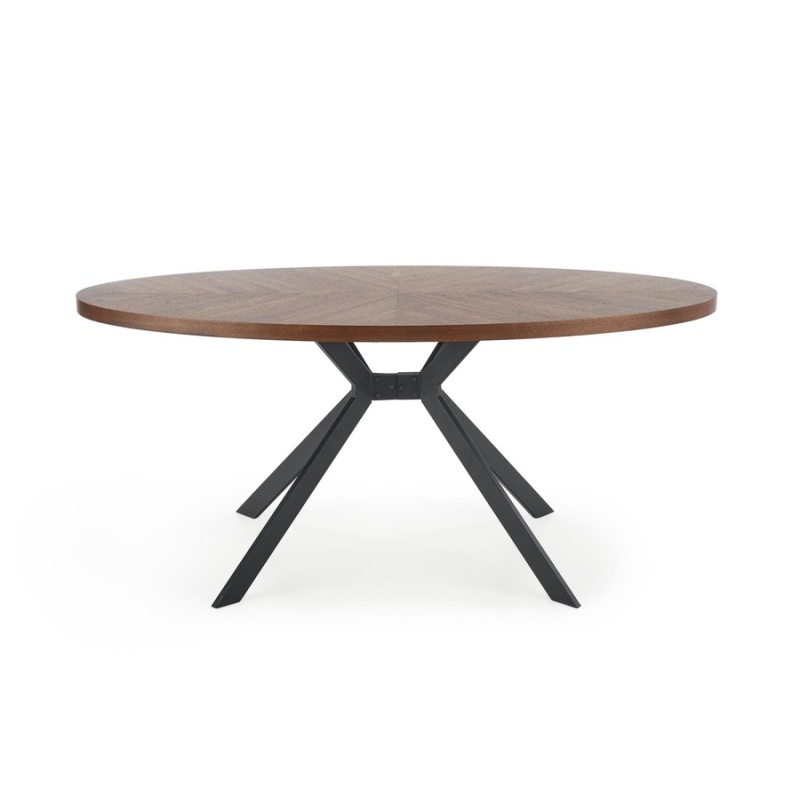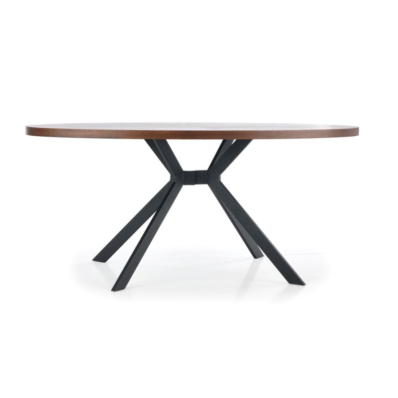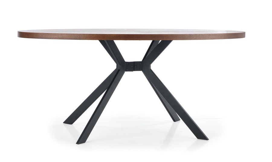 Трапезна маса – с овален плот е мебел, който е напълно подходящ за пространството на трапезарията, кухнята и дори хола. Върхът с площ от 170 × 90 см е направен от MDF и естествен фурнир в сянка на орех, върху който се вижда зърното. Представеният модел е поставен върху стабилна основа, изработена от осейдена от прах стомана в черно. Устойчивата основа се състои от четири крака, които са декоративни наведени, благодарение на които мебелите печелят в индустриална форма. Моделът хваща окото с необичайно подреждане на бурканите, благодарение на което никой няма да премине покрай мебелите безразлично. На овална маса с модерен дизайн лесно ще се побере от 6 до 8 души – всеки ще гарантира нужното пространство за ядене.