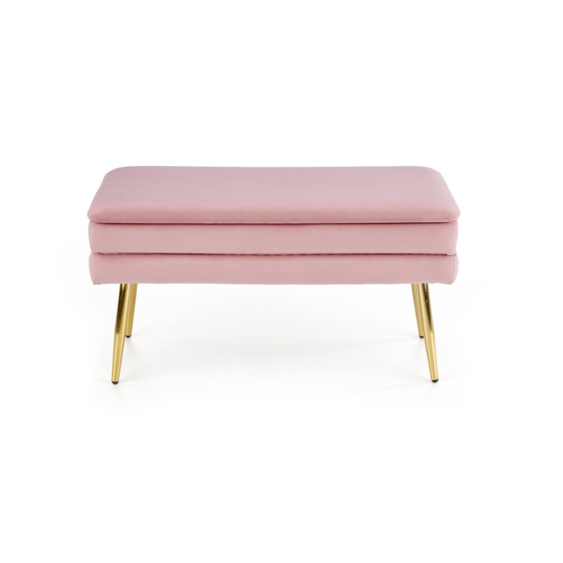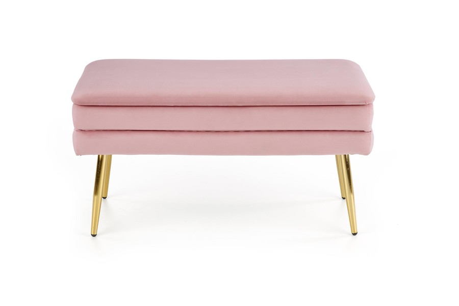 Розовата пейка с контейнер е мебел, завършена в бляскава естетика, която ще изглежда страхотно в хола, спалнята и дори модерно завършен коридор. Можете да влезете в контейнера, като плавате седалката – можете да съхранявате различни малки аксесоари в него. Пейката без опора е напълно тапицирана с кадифена тъкан при розово оцветяване. Материята, използвана в производствения процес, е мека и приятна на пипане, а също така изглежда естетически, благодарение на която никой няма да премине безразлично. Съвременната скамейка е поставена на средна височина на хромирани стоманени крака в златист цвят. Пейката с функция на контейнера ще бъде допълнително място, за да седнете за поканени гости или удобно място в коридора, където можете удобно да облечете или премахнете обувки.