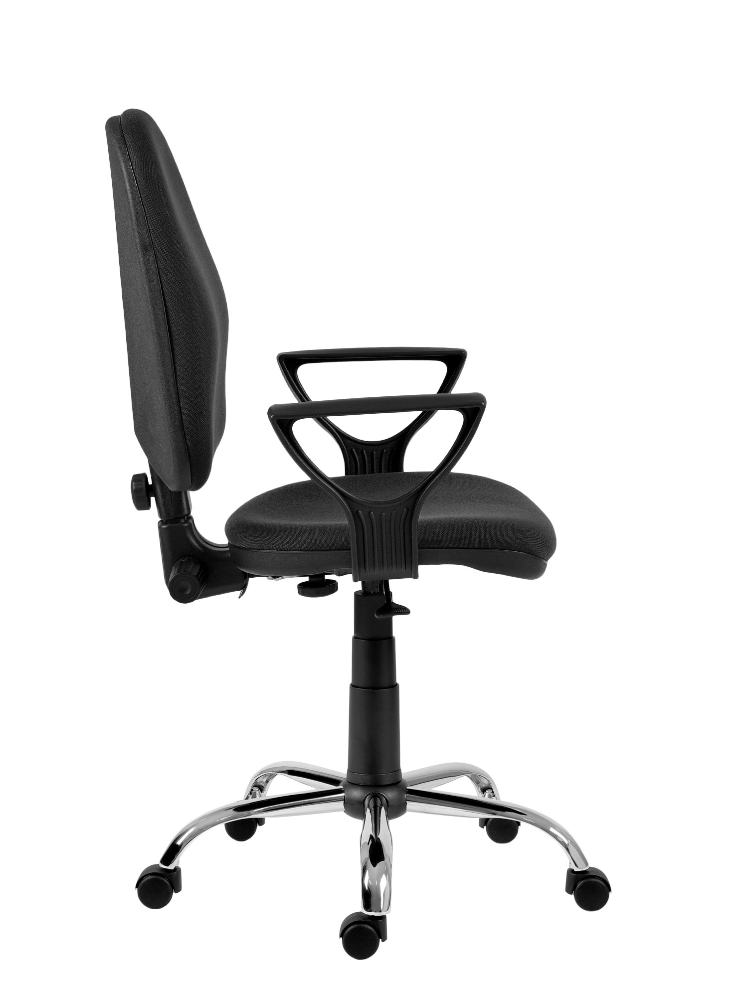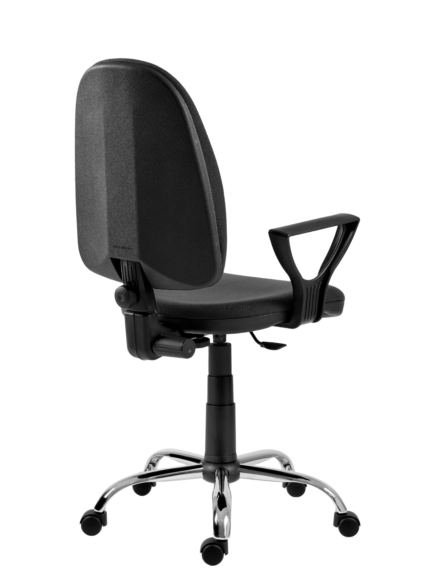 Работен стол с висока облегалка с лумбална опора. МЕК – механизъм за регулиране ъгъла и височината на облегалката и дълбочината на седалката. Газов механизъм за регулиране височината на седалката. Тапициран с дамаска Cagli eco в черен цвят. Хромирана кръстачка. Статични пластмасови подлакътнци. Максимално натоварване до 130 кг. Произход – ЕВРОПЕЙСКИ СЪЮЗ. Сертифициран от SZÚ – Европейски инженерно-изпитателен институт. Гаранция 36 месеца.
