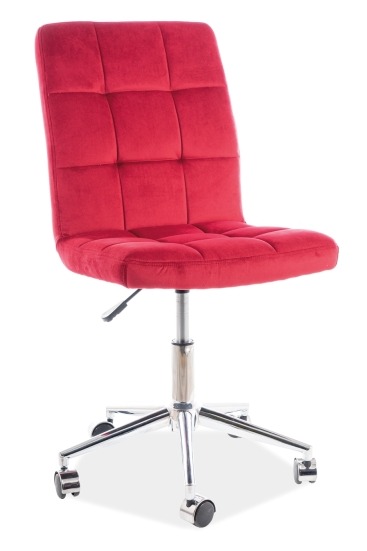 Офис стол – Ротационното фотьойл е бургундска структура без подводничество, което е идеално за пространството на младежката стая или модерен частен офис. Профилиран блок ще осигури удобна седалка на бюрото по време на работа, изучаване и дори ще почива пред компютъра. Ватираният и декоративен пробит фотьойл е тапициран с кадифена тъкан, който изглежда ефективен и е приятен на пипане. Офисното кресло остава на основата, която се свързва с хромираната рамка – пет колела максимално увеличават подвижността на структурата, която може да бъде преместена около избраната стая. Моделът има вграден механизъм, който ви позволява да регулирате височината на седалката-тя може да бъде адаптирана към индивидуалните предпочитания на текущия потребител.