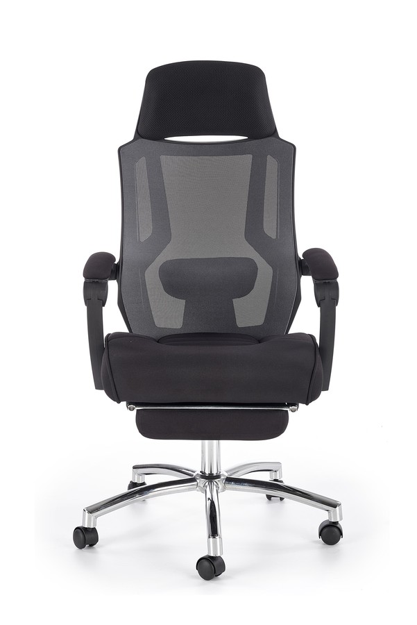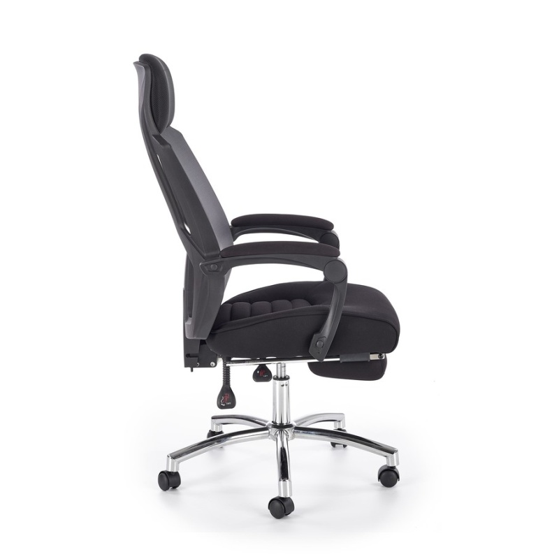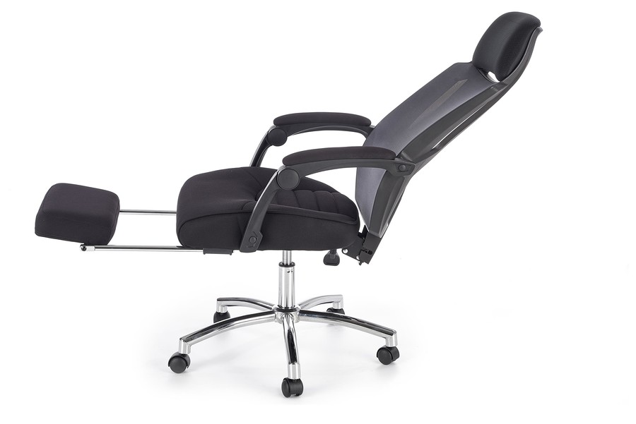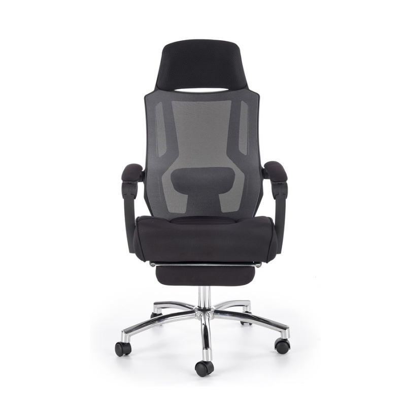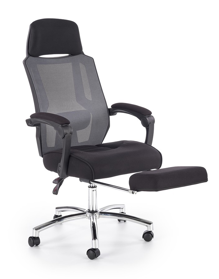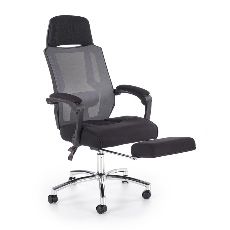 Президентски офис стол ще се хареса на всички хора, които прекарват много време на работа зад бюрото. Стола е оборудвано с много удобства, благодарение на които ще се провеждат много часове работа или обучение при удобни условия. Мебелите имат практични, меки подлакътници. Освен това е оборудван с прибираща се подложка за крака, което ви позволява да опънете краката си и да почивате в свободно положение. В допълнение, креслото има и вграден механизъм за наклони, което позволява безплатно регулиране на височината на седалката и ъгъла на облегалката. Президентският офис стол е позициониран върху база под формата на кръст на колела. Благодарение на тях можете лесно да се движите из стаята, без да се налага да ставате от стола. Продуктът е покрит с естетическа и функционална мембрана тъкан черна и сива мрежа.