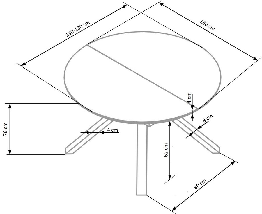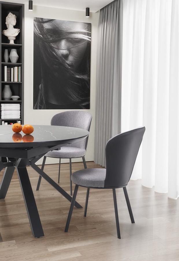 Трапезна маса – Черната кръгла маса е отличен елемент от оборудването на трапезарията или пространството за хол. Кръглата маса е сгъваема мебел, благодарение на които от 6 до 8 души лесно могат да се поберат в нея. Горната част преди разгъване има диаметър 130 см, докато след добавяне на вложката, тя се превръща във форма с 180 × 130 см овал. Моделът на световъртеж е поставен върху четири стабилни крака, изработени от прахообразна стомана до черно. Представената основа не само осигурява на мебелите адекватна издръжливост и стабилност, но също така влияе върху естетиката на модела. Кръглото плот е комбинация от лакиран и висококачествен стъклен MDF, който е завършен в черен декор.