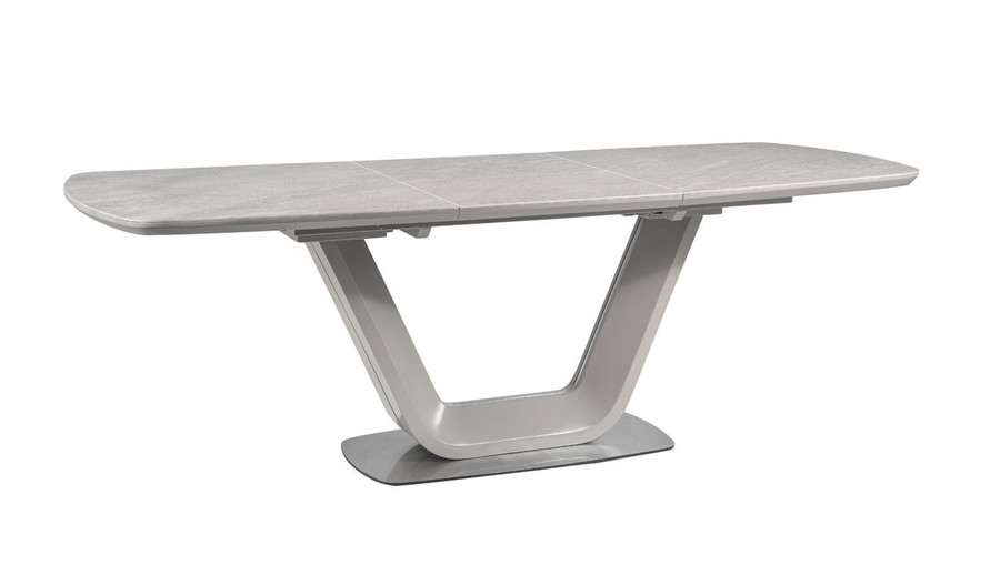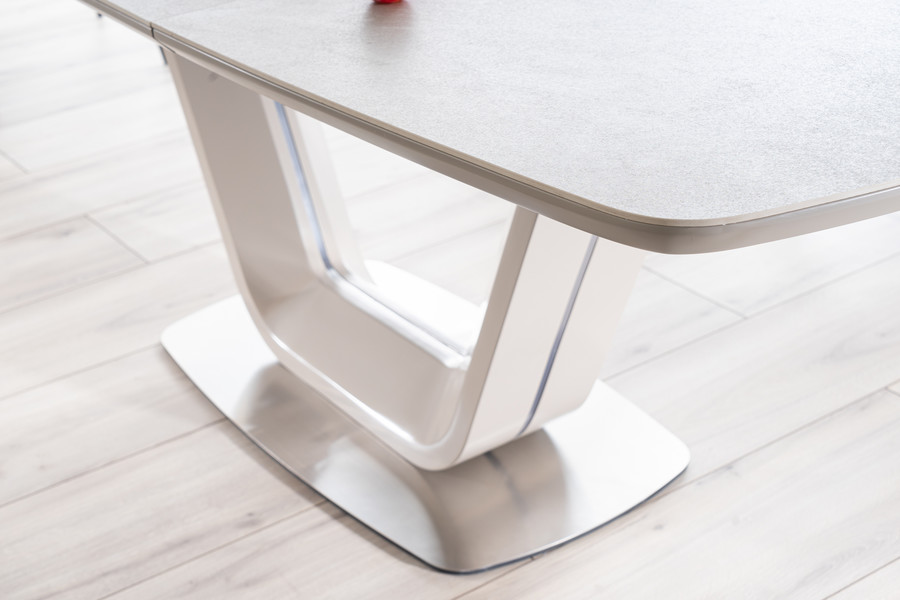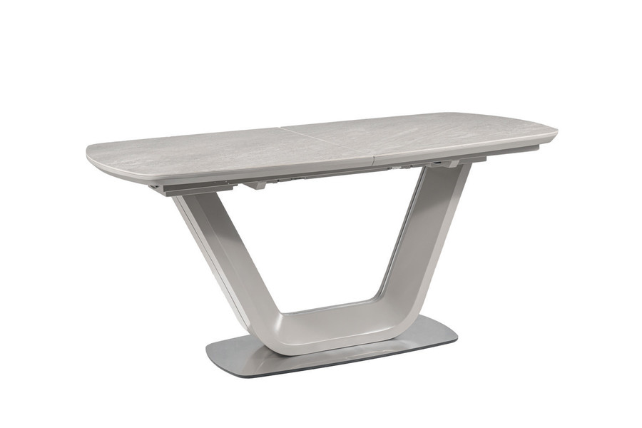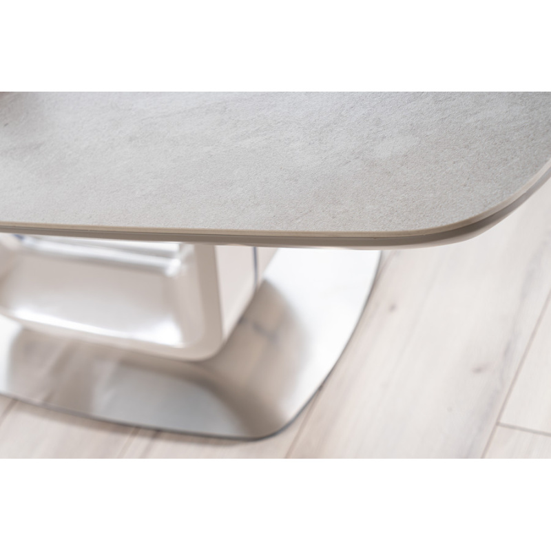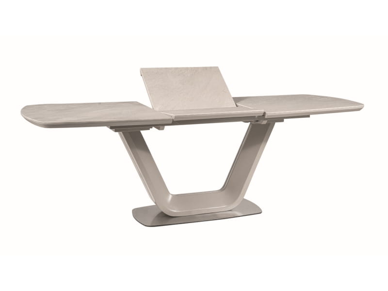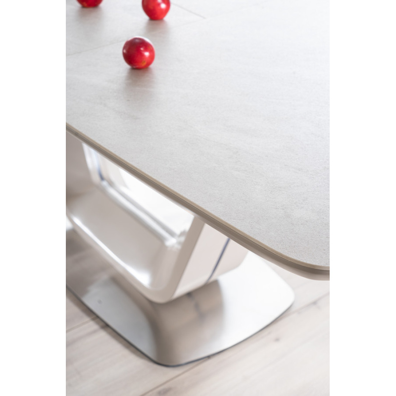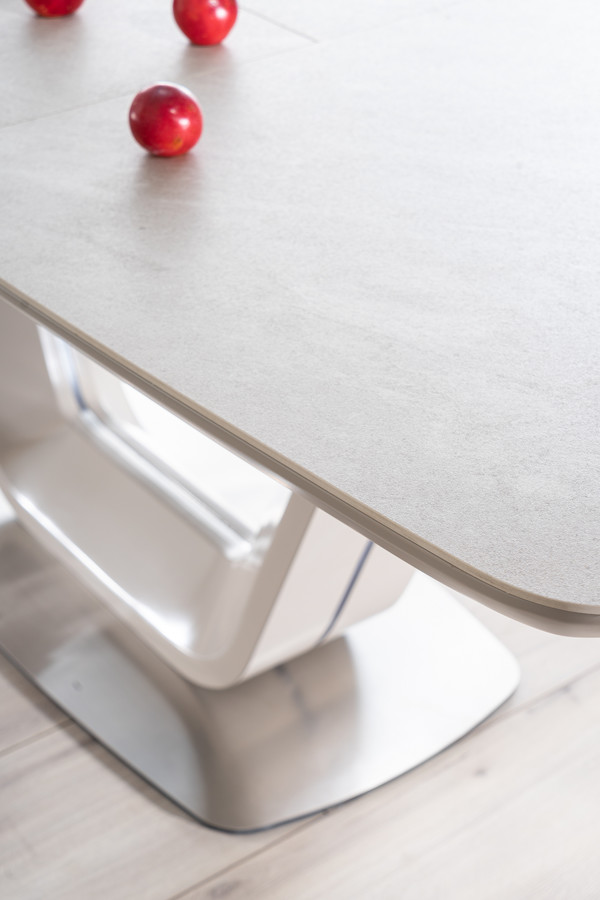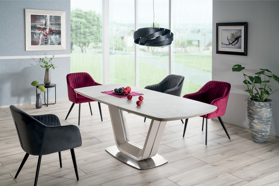 Трапезна маса – маса е много ефективно проектирано модерно парче мебели, което се характеризира с уникална форма. Завършването на масата означава, че не можете да отидете безразлично към него. Мебелите ще се харесат на хората, които ценят уникални форми и висока функционалност на мебелите в обкръжението си. Масата е страхотна в модерна трапезария или хол. В допълнение, таблицата може да се превърне в ефективен елемент от домашните и търговските външни договорености. Горната маса е правоъгълна и има заоблени окончания. Този елемент е изработен от материали, които са комбинация от MDF и керамична плоча. Основата за плота са елементи, създадени от MDF сместа с метал. Масата има два крака, които са свързани към средата, които са свързани с плоска и стабилна основа. Предимството на таблицата е фактът, че тя се разпространява, благодарение на която увеличава дължината си.