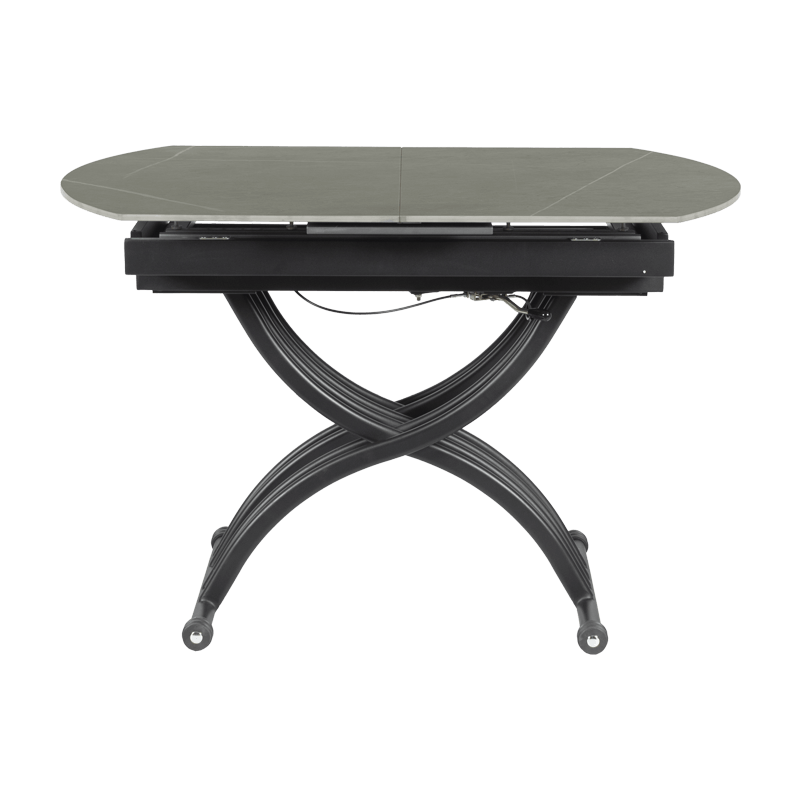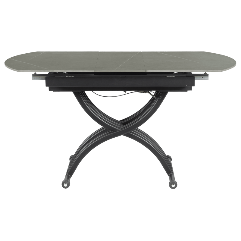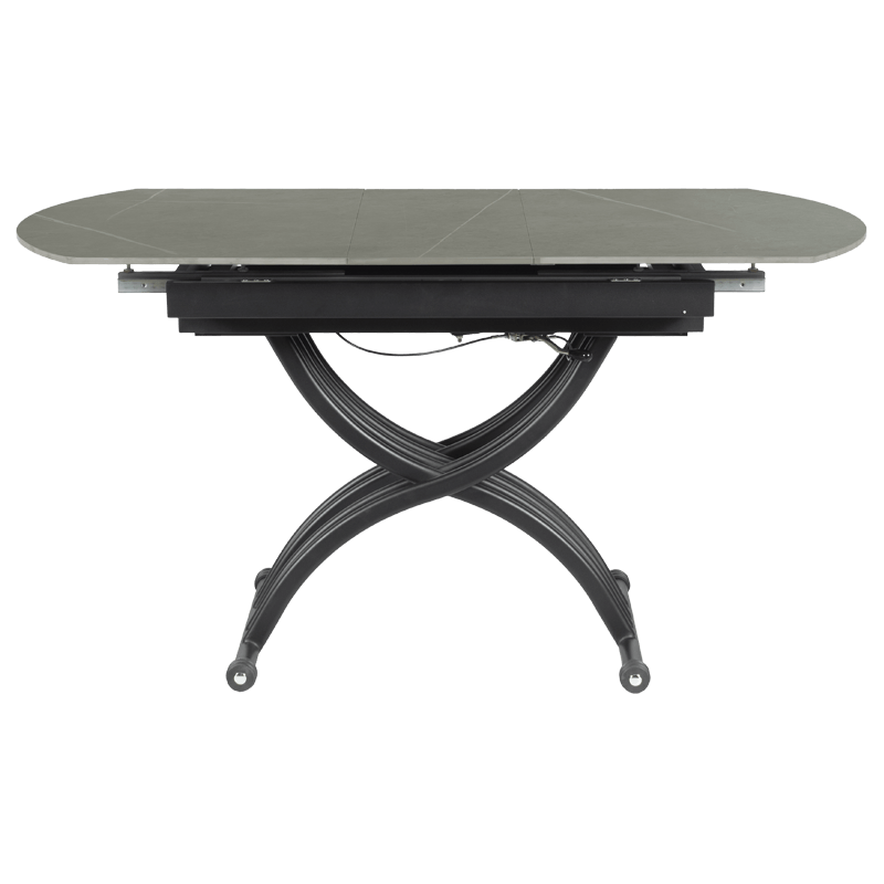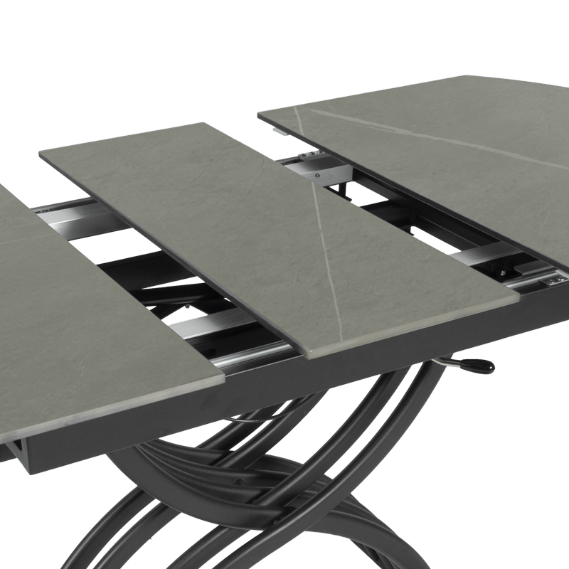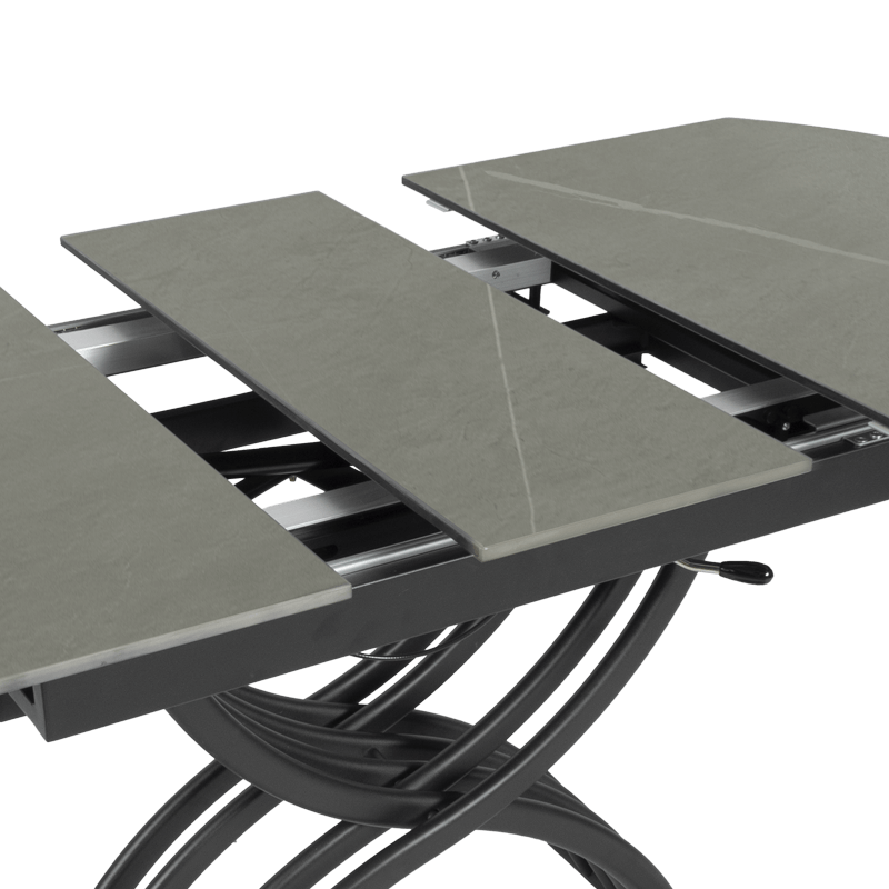 Масата е идеалният избор за тези, които търсят съчетание между функционалност и елегантен дизайн. Разполага с иновативен повдигащ механизъм, който позволява лесно регулиране на височината от 38 до 76 см, превръщайки я от холна в трапезна маса с едно движение. Разтегателният механизъм с модерна слайд система разширява плота от 120 до 150 см, като запазва широчината от 80 см. Керамичният плот осигурява изключителна здравина и стабилност, а съвременният му вид добавя усещане за лукс и уникален стил към вашия интериор. С тази маса лесно преминавате от сутрешното кафе към обяд или вечеря с приятели и семейството – всичко в един изискан и практичен продукт. Пълна информация за размерите и характеристиките на модела ще намерите в таблицата в таб/поле „Техническа информация“.