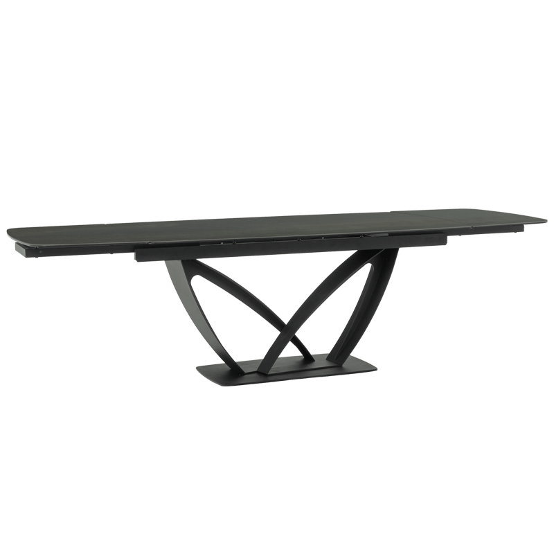 Разтегателната трапезна маса впечатлява с интересната си и масивна основа, изработена от прахово боядисан метал, която съчетава стабилност и модерен дизайн. Тя разполага с правоъглен плот, изработен от керамика и закалено стъкло с елегантни шарки, наподобяващи мрамор. С дължина от 180 см, масата може да се разтегне до внушителните 280 см, осигурявайки достатъчно пространство за всички ваши гости. С широчина от 100 см, тя е идеалният избор за тези, които ценят естетиката и комфорта. Пълна информация за размерите и характеристиките на модела ще намерите в таблицата в полето „Техническа информация“.