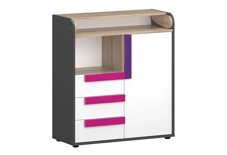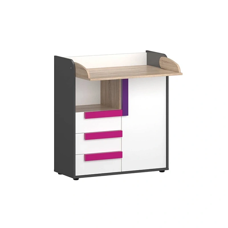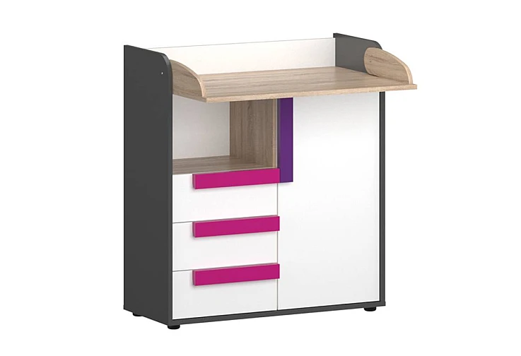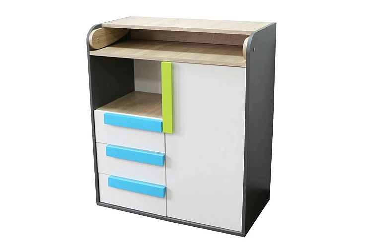 Скрин за повиване Алекс е идеалното допълнение към модулната система за обзавеждане на детска стая Алекс. Представлява функционален и стилен елемент с едно шкафче, три чекмеджета и практична отворена ниша. Изработен е от висококачествено ПДЧ в бял цвят с плот от естествена дървесина, снабден с механизми за плавно затваряне Hettich и Huffel. Дръжките на чекмеджетата са в наситени цветове по избор: лилав, лайм, розово или синьо.