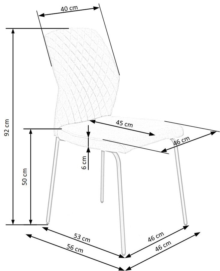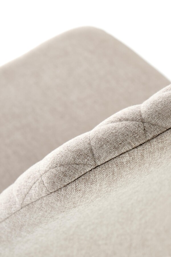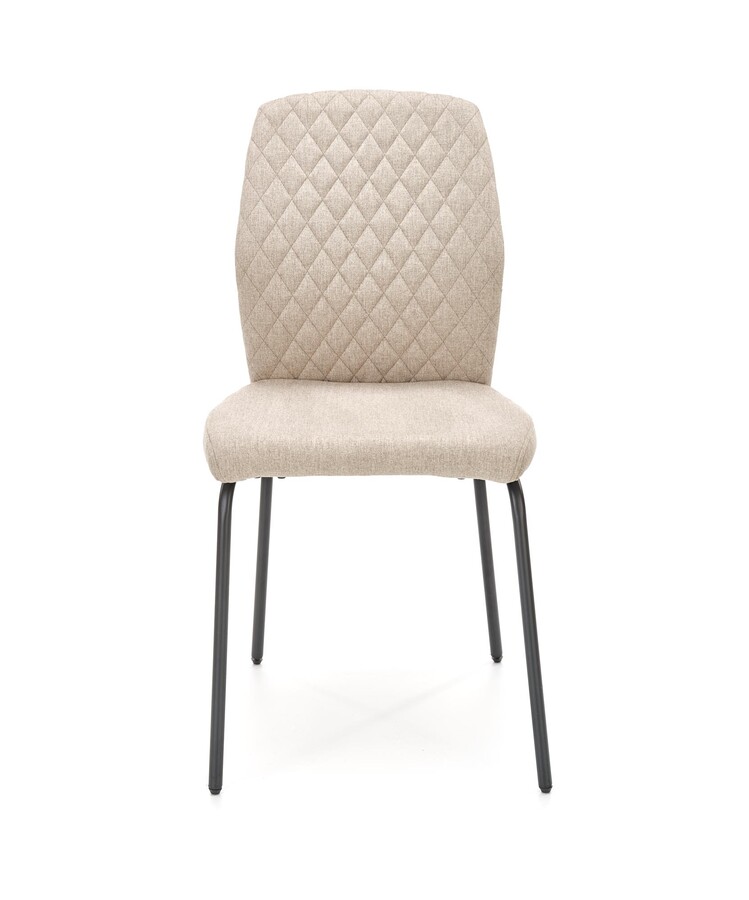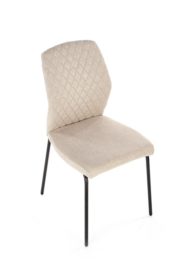 Стол – Прост, минималистичен стол е елегантно допълнение към стилни интериори. Той работи чудесно в кухнята, трапезарията или хола – за предпочитане в компанията на други столове в същия модел, добавен към масата. Характерна особеност на стола е силно наклонена опора от половината от височината му. Подобно профилиране работи чудесно по време на дългосрочно седнало положение. Представените мебели са тапицирани с бежова тъкан, докато вътрешността на облегалката е украсена със стилно шевово ромб. Използваемата част е вградена върху прави крака, изработена от черна стомана, богата на прах. Безвремието на този цвят и минимализъм на дизайна на стола ви позволява да го използвате във всяка подредба.