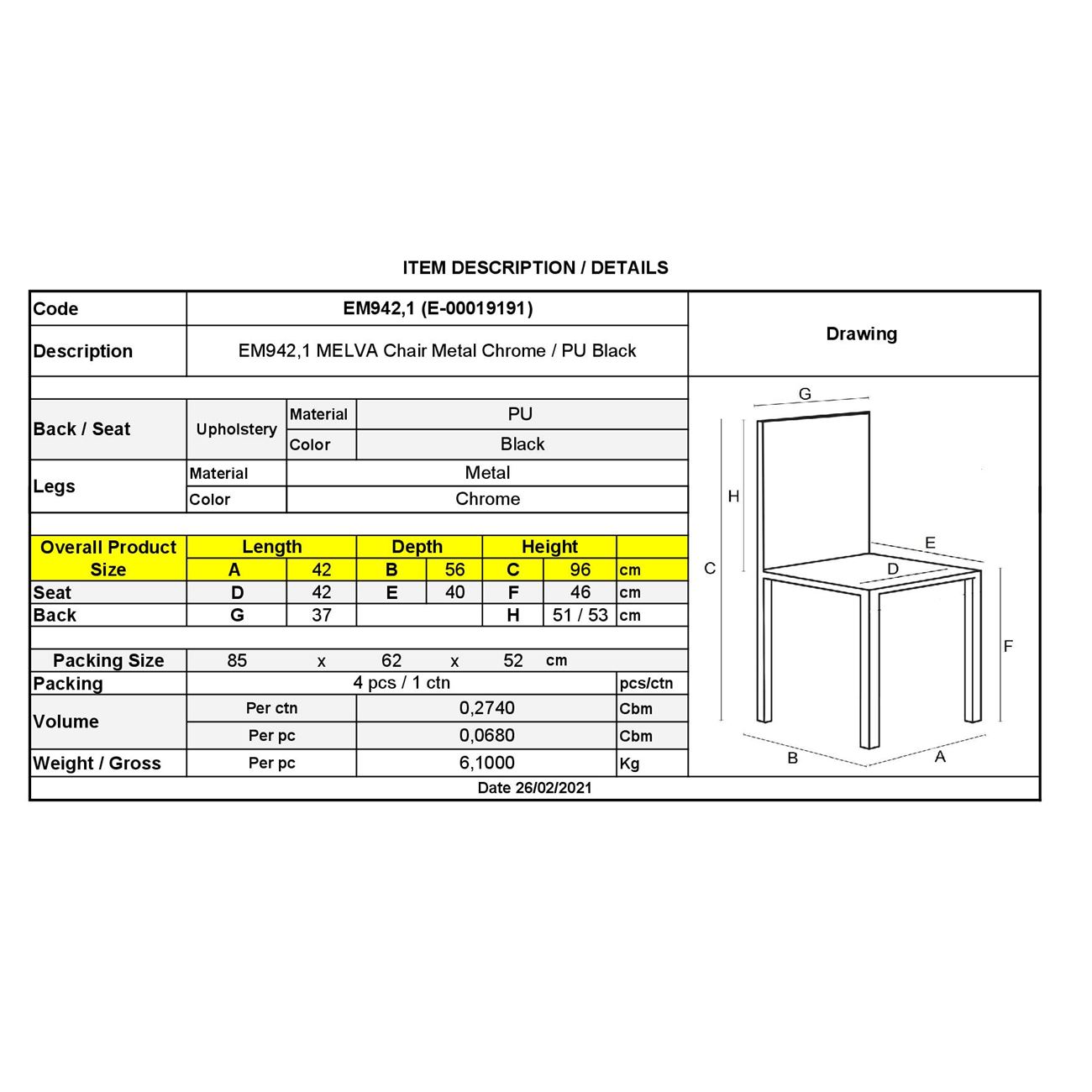 Столът е проектиран с изчистени линии и елегантни форми, което му придава изключително изискан вид. Седалката и облегалката са облечени в качествено покритие, осигуряващо мекота и уют при продължително сядане. Лек блясък и елегантен стил са постигнати благодарение на специално подбрания материал за обвивката.